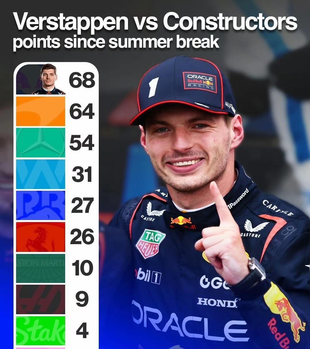 夏休回来之后,维斯塔潘一人得分多于其他9支车队,除了红牛。 夏休后一共三站比赛:维斯塔潘2冠1亚共68分。