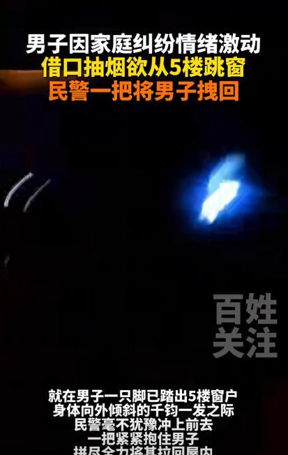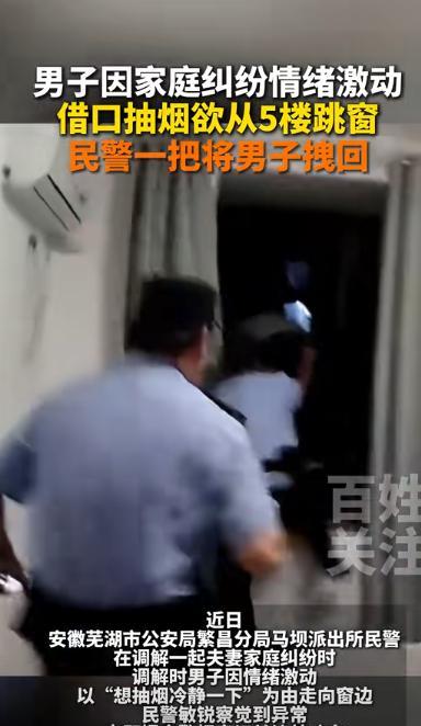 是什么把一个男人逼成这样?安徽芜湖一男子和妻子吵架后,借口去阳台抽根烟冷静一下,可他趁人不注意的时候转身准备从5楼窗户跳下去,幸好在场的民警反应及时把他拽回来,要不然一个家庭就这样散了! 据百姓关注9月22日报道,在安徽芜湖的一户人家里面,上演了异一场很惊险的一幕,一名男子悬挂在半空,只靠着有人紧紧抓住他的裤腰带才没掉下去。 事情的起因是,在近几年来小王(化名)和妻子的关系出现了问题,因为家里面的经济压力越来越大了,很多事情都需要精打细算长时间以来妻子就少不了啰嗦。 所以每次只要小王下班回家之后首先听到就是来自妻子的数落,久而久之这种情绪在小王的心里面沉积久了之后就需要释放出来。 于是在那天晚上,小王一回来的时候妻子闻到小王身上的酒味的时候瞬间就生气了,说了几句刺头话,说小王有时间喝酒还不如去挣钱,让家里面富裕一些,这时候小王在一边没有说话。 直到妻子开始拿他和别人作对比的时候,小王立马就生气了,两人就这样吵了起来,而且吵得声音特别大随后妻子直接就把手里面的碗碟、锅子砸在地上,用碎裂声表达愤怒。 邻居听到这之后立马就报了警,害怕这一家一会出事情吵得这么凶,就在警方赶来的时候,小王和妻子也没有停止战斗,妻子说不过小王之后直接就扇了小王一耳光。 扇完巴掌的时候妻子也懵了觉得自己做的有些过分,但又不知道该怎么来缓和就愣在了原地,但这时候小王身上的所有压力和委屈集中爆发。 就在这个时候民警敲门进来了,了解情况之后正在进行调解时,小王突然说自己抽根烟于是就来到窗边,不料这时候小王直接猛的一下就准备跳下去。 好在民警反应及时拽着他的腿给拽了上来,避免了事故的发生。这不仅救下一条命,也让这个岌岌可危的家庭暂时停了下来。 最后夫妻双方是否愿意坐下来,把矛盾说清楚,用沟通来解决问题,而不是靠沉默、摔东西或者极端行动来表达,这才是关键。 通过这件事情告诉我们,夫妻关系需要相互体谅,干一天活回家的丈夫需要的是谅解,而不是一味地责怪,长期处于这种压抑的环境里时间长了谁也受不了。 那么你还有什么想说的吗?