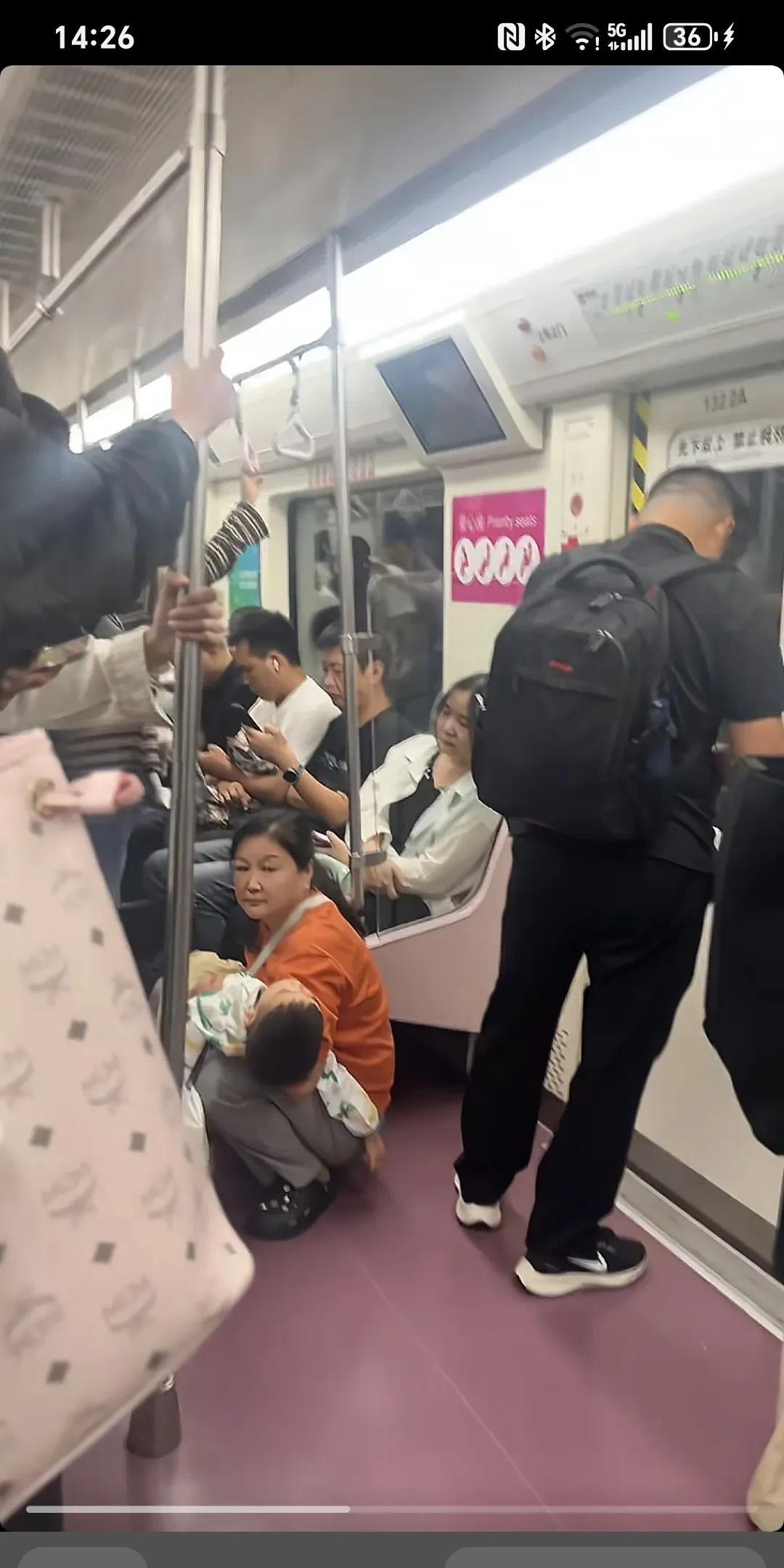 地铁上发生扎心的一幕... 一位中年妇女蹲在那里怀中抱着睡觉的孩子,但没有一个人