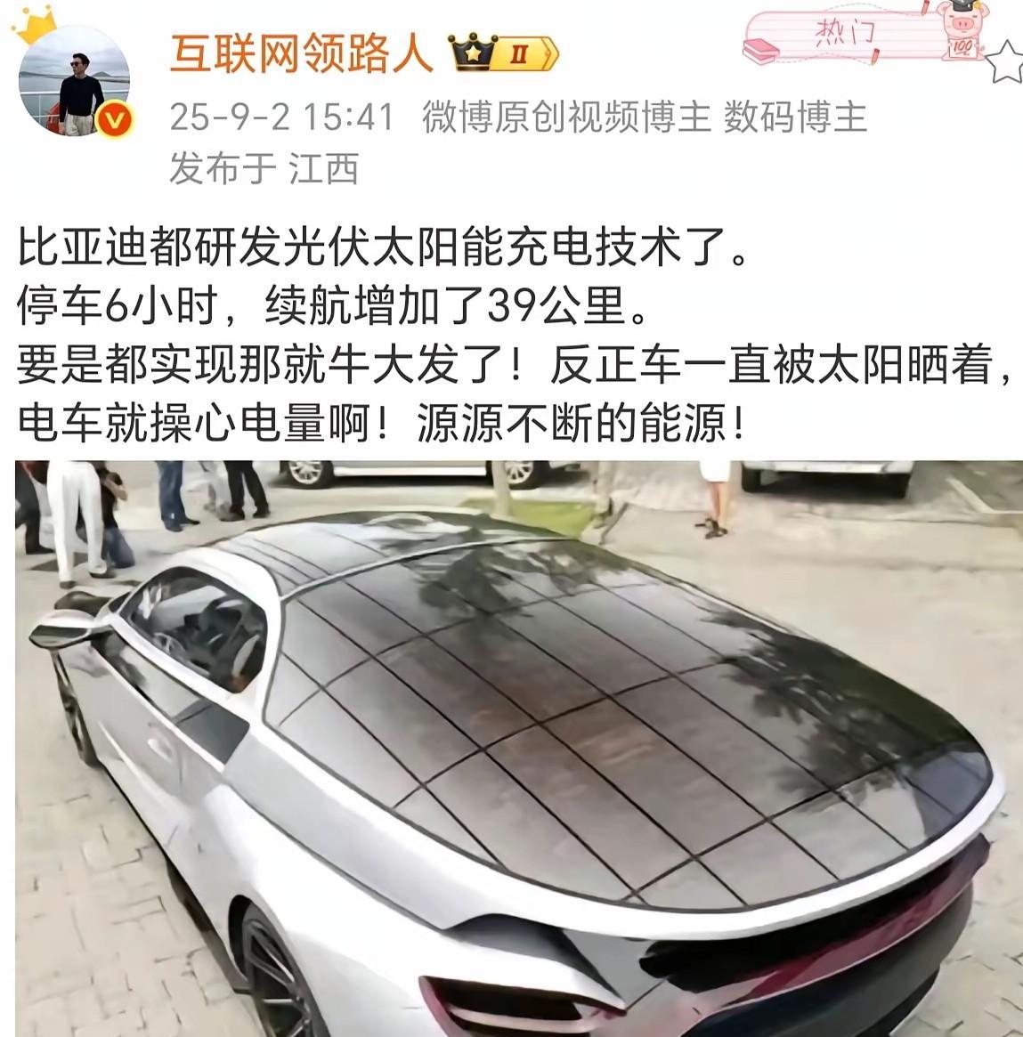 车顶充电普及之后,地库停车该怎么办? 现在,电动汽车的车顶充电技术已经有了非常大的突破,晒了一天,续航提高几十公里将不再是问题,那么如果车顶太阳阳光充电普及之后,白天电车还愿意下地库嘛? 与之同样的问题还有: 1.小区建筑外墙用了光伏墙板,自己家用电是不是可以便宜很多? 2.小区停车库是不是变成了巨大的鸡肋? 3.路边公共停车场的树木重要性已经不那么重要了。 4.电车被充电之后,会不会带来能源行业的巨变?要是房车的话,停在公园免费车位上,它是不是晚上空调和灯光,看电视都不要钱了? 满世界的电车会不会变成一种能源生产工具?