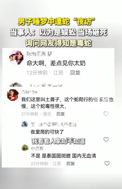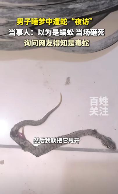 死里逃生!江苏常州一名男子晚上睡觉,在睡梦中猛然惊醒,突然感到身上凉飕飕的,睁开眼睛看到,竟然是一条蛇,被吓到了。 据百姓关注9月22日消息,一男子夜半正在睡得香的时候,迷迷糊糊地将一条蛇误看作是蜈蚣猛的一下给甩到了地上,等他看到地上是一条蛇的时候,顿感胆战心惊。 事情的起因是因为王大哥(化名)想着最近的天气也没有那么热了于是就把房门给打开了想着从门里面透气了一丝凉气的话就不需要开空调了。 就这样很快王大哥便进入了梦乡,然而就在半夜他睡得正熟做梦的时候,他突然感觉到身体有冰凉的东西爬上来。这时候的王大哥并没有大惊小怪觉得在乡下有虫子很正常。 在他心里面就以为是蜈蚣就没太在意,随后他便猛地一甩将他甩了下去,这时候王大哥听到了“咚”地一声他立马起来给这个误以为是蜈蚣的东西给打死了。 随后王大哥开开灯的时候,看到地上的东西的时候吓得他心脏扑通扑通的跳了起来,竟是一条蛇,等王大哥缓过神之后就近距离的看了一眼这个蛇,不懂行的他也看不出什么,于是就拍照发到了短视频平台上面想要询问一下网友这个蛇有没有毒。 很快就有懂行的网友在下面评论说,这条蛇看起来像是圆斑蝰,而且还是一条剧毒蛇。当“剧毒”两个字被网友点名后,这件事的性质立刻变了。 原本只是惊奇的小插曲,瞬间被拉升到生死关头,评论区一下子炸开,有人说“命真大”,有人感叹“真是死里逃生”。 直到这时,男子才真正意识到,自己那晚面对的不是普通麻烦,而是致命危险。 好在王大哥睡觉比较浅这次没有使他受伤,不然要是他没有感受到有东西在他身上,或者是没有迅速将胳膊上的东西给甩下去的话,后果不堪设想。 这件事提醒人们,农村夜晚一定要关好门窗,不能掉以轻心,有时我们以为的“小麻烦”,可能其实是致命威胁。对此还有什么看法呢?