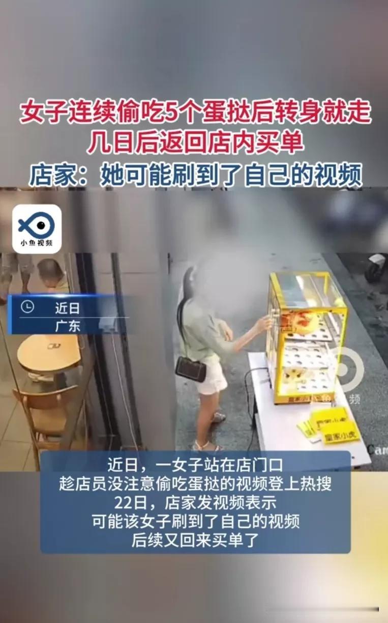 广东,一女子站在店门口,趁店员没注意偷吃5个蛋挞。几日后,女子不仅回店里买单了,