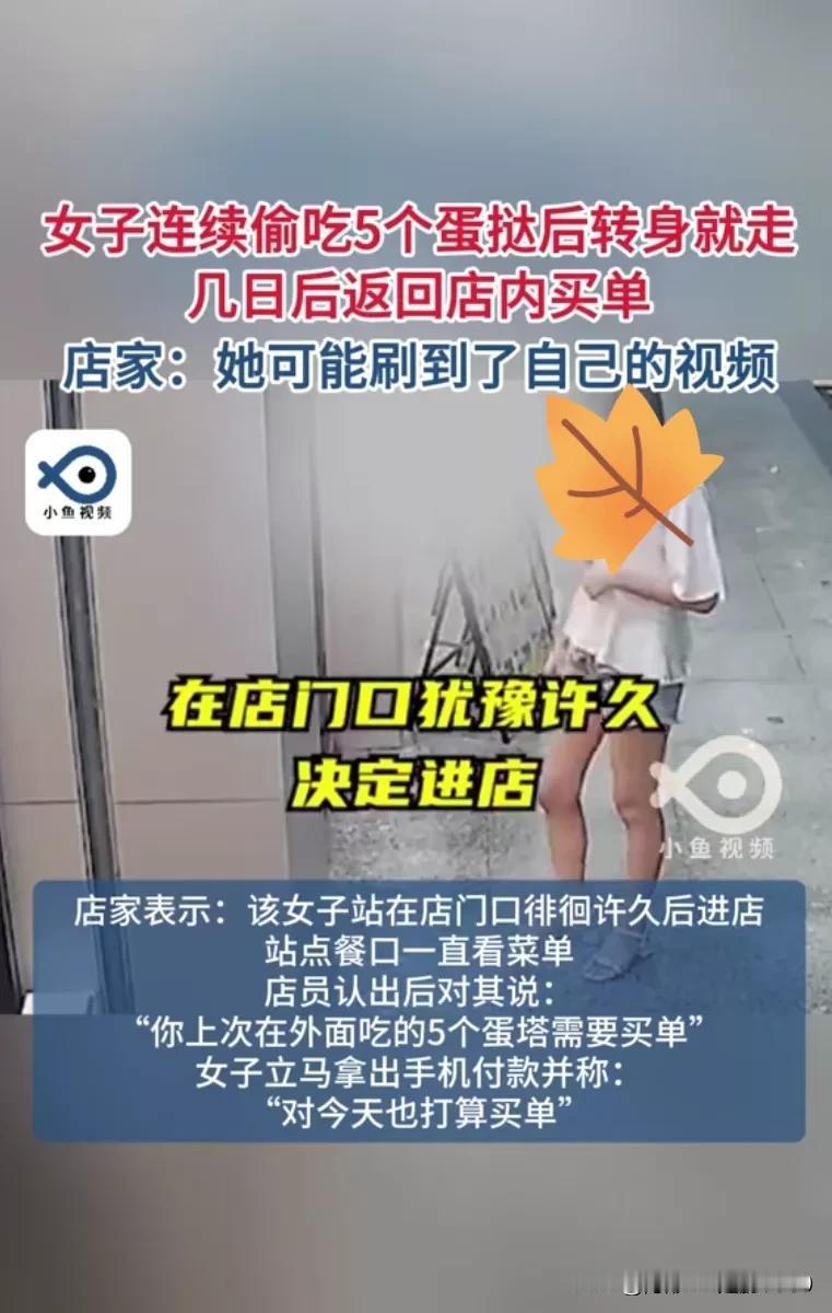 广东,一女子站在店门口,趁店员没注意偷吃5个蛋挞。几日后,女子不仅回店里买单了,当日点的,也买了单。 店家:她可能刷到了自己的视频。 退一步讲,女子很勇敢!她完全可以让别人来付款,或者打电话问店内的收款方式,添加后,再付款。可是她亲自来了,面对店家提出之前的蛋挞需要买单,女子“顺水推舟”,没有狡辩,并说今天的也买单。 该说不说的,女子的心态不是一般的好吧,还能再次光顾此店。