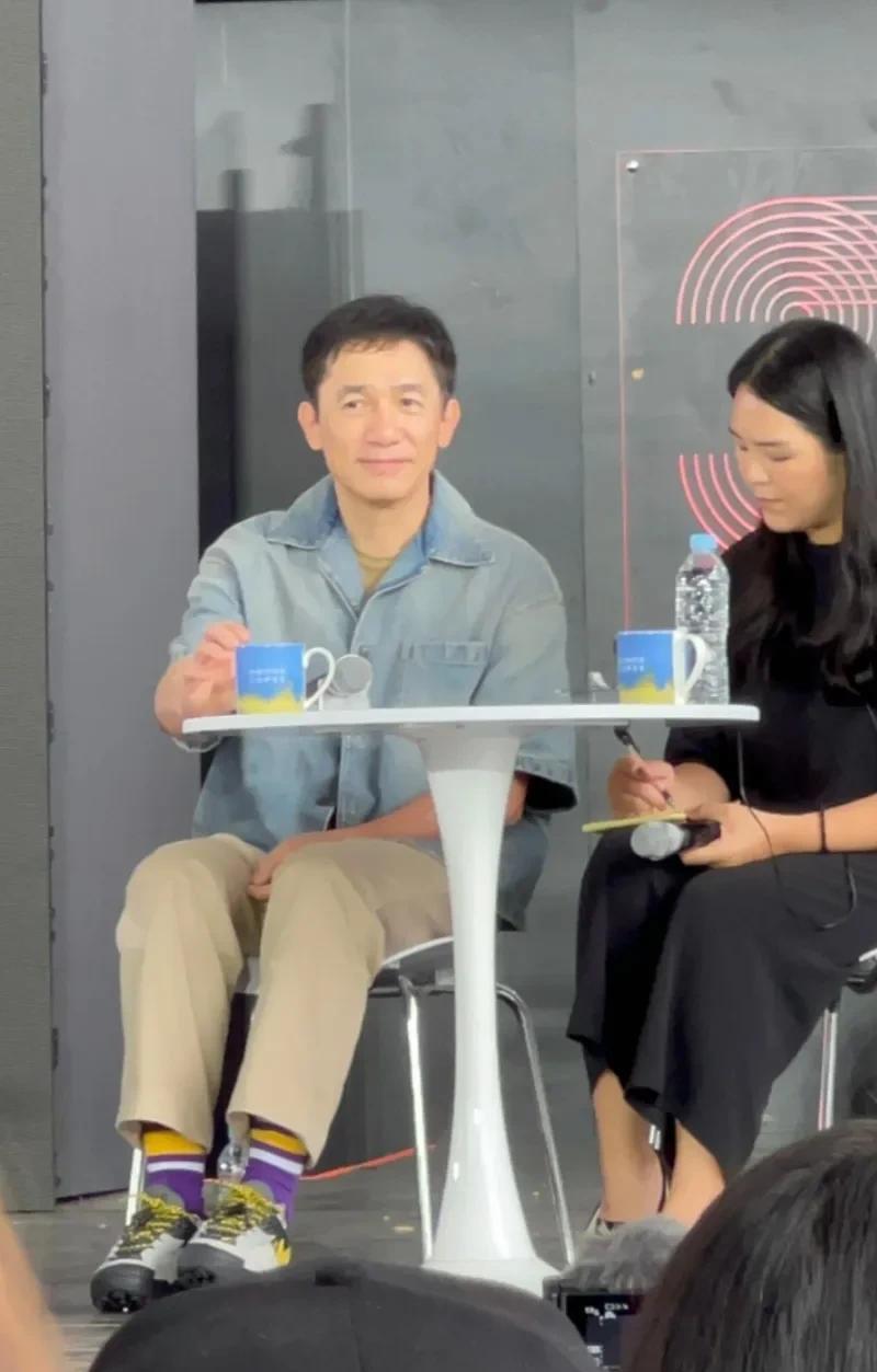 63岁的影帝梁朝伟现身韩国釜山电影节,他穿着牛仔短袖,赤色长裤,脚上的紫色袜子很