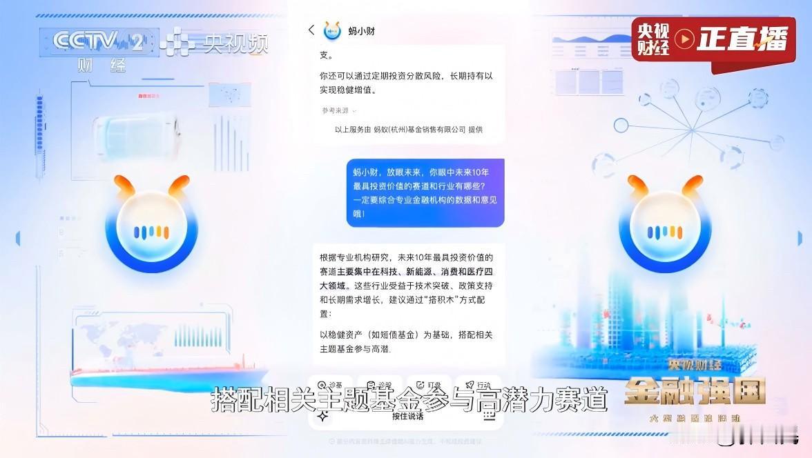 大家发现了吗?国庆假期前,一个理财AI站央视屏幕C位,这是非常好的信号! 昨晚央视财经“金融强国——外滩大会之夜”,发生个新鲜事:蚂蚁财富旗下的AI理财助理“蚂小财”,竟成了央视主持人的“AI搭档”,还现场对市场行情、稳健理财、未来赛道等3个专业理财问题进行解答,分析得头头是道。 那问题来了,央视主持人为啥请一个AI理财助理?这背后有何深意? 其实不难理解,蚂小财的背后是蚂蚁自研+金融场景特训的专业模型,数据源接入了200多家持牌机构,相当于有个金融“最强大脑”和“专业养料”。不像一般通用大模型,因数据来源太杂,容易一本正经胡说八道。反观蚂小财,它在一众国内外大模型中,对于金融理财专业的表现排名第一,还能诊基、诊股、盯盘,靠专业度登上央视。 更关键是,光有专业不够,关键是这AI为谁服务? 举个例子,OpenAI打算推出的“博士级ChatGPT”代理,瞄准高端金融、医疗行业等客户,传闻月费高达2000美元。而蚂小财呢?Quest Mobile半年报显示,蚂小财在“AI专业顾问”中排名第一,用户超7000万,45%来自三四线城市。换个说法就是,过去难以被传统理财师服务到的普通人,现在打开支付宝就能免费咨询专业理财问题,这与国家推动的普惠金融战略可以说不谋而合! 由此可见,蚂小财登上央视C位,不仅是对其专业度的认可,更是对一种普惠方向的肯定。