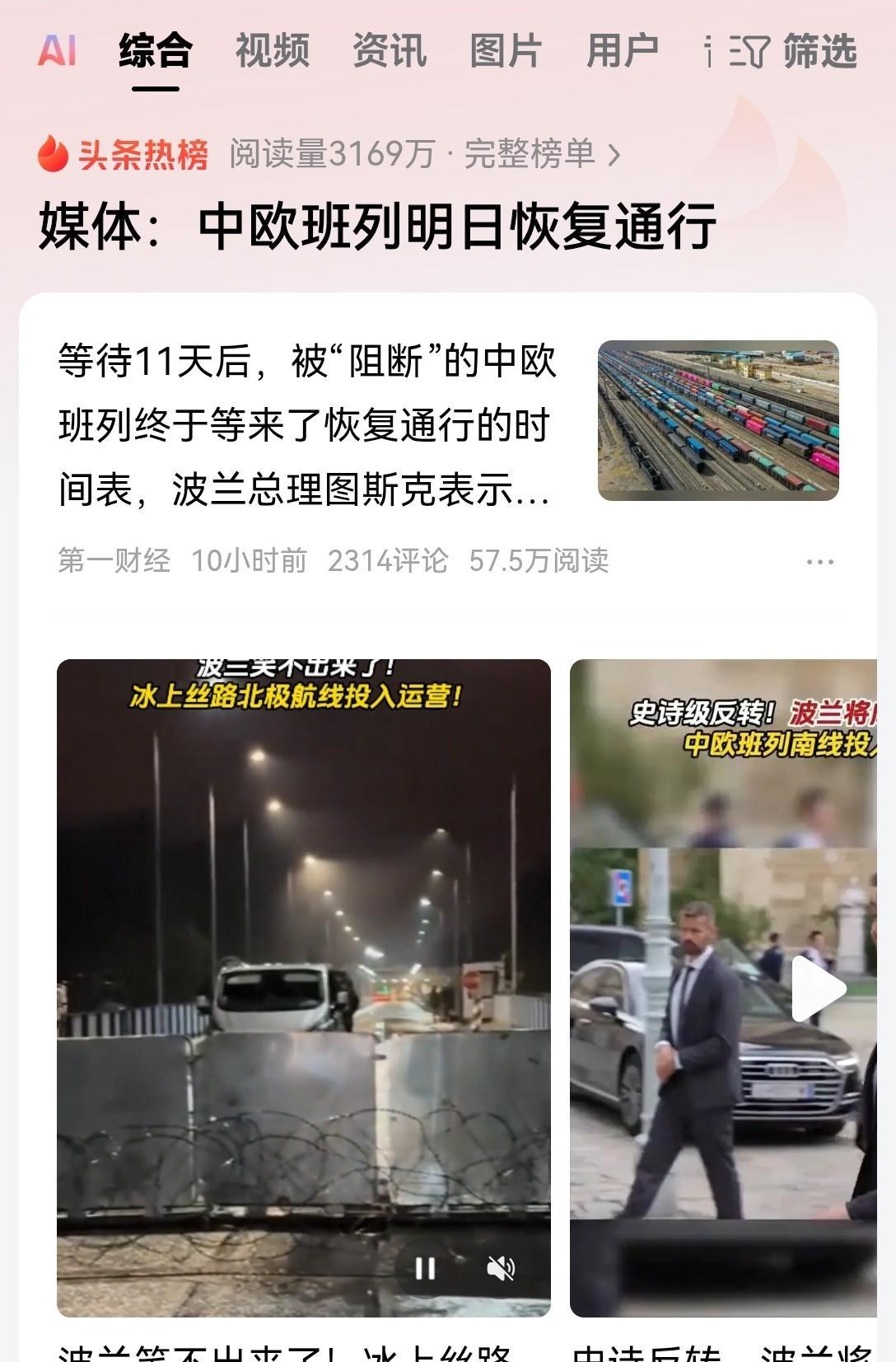 折腾了11天,波兰最终还是开放了口岸,中欧班列即将恢复通行! 据央视新闻报道称,波兰总理图斯克表示,波兰将于25日凌晨,重新开放和白俄罗斯之间的边境口岸。 中欧班列届时可以恢复通行! 但是波兰总理在发表完讲话之后,还恶狠狠地留下了一句威胁。 他表示如有必要,波兰还会再次关闭口岸。 没想到啊,波兰一共就坚持了11天,还以为他能挺多长时间呢,结果最后就折腾了11天! 那么波兰为什么又恢复开放了口岸呢? 原因很复杂,主要是波兰受到了太多的压力。 首先第1点,中国作为中欧班列的发起国,受到的经济损失是非常巨大的。 中国肯定要对波兰施加巨大的压力。 第2点,白俄罗斯的压力也非常大,白俄罗斯和俄罗斯都是一条线的,中欧班列都要从他们那过。 过路费这个东西不是你波兰一家赚,沿途所有的国家都要赚这个钱。 你波兰现在断的是中国一家的财路吗? 你挡的是人家白俄罗斯和俄罗斯之间的财路 第3点,欧洲方面的压力也很大,尤其是德国的。 积压的300趟中欧班列,你知道上面有多少德国工业急需的原材料? 你知道那上面有多少圣诞节要用的小商品? 你知道那里面有多少德国制造业需要的零部件? 不仅是德国,包括法国,荷兰,匈牙利,捷克,斯洛伐克等等,周边的国家都是有货源的。 波兰你这么搞,实际上是把这一圈国家都给得罪了。 人家等着这些货物开工呢,人家等米下锅呢! 你说堵死,就堵死?这些国家亏钱了之后是要找你波兰麻烦的。 第4点,中国明显加快了北极航道,还有中欧班列南线的投资力度。 这才是波兰最害怕的一点! 波兰每年从中欧班列身上可以吃20亿美元的过路费! 您真的觉得这点钱少啊?这可是没本的生意,上火车做点检查盖个图章,这钱就赚到口袋里面去了。 白捡的钱啊! 一旦把中国逼急了,大量的运输货物走北极航道,还有欧洲南线。 波兰每年减少20亿的纯利润进账,你当他不心疼吗? 同时这门生意还解决了上万个工作岗位! 到时候1万多工作岗位全都消失了,波兰,这些工人不找你麻烦吗? 所以说嘛,断人财路,如杀人父母! 波兰的脑子还是要清醒清醒的,你搞了这11天,转圈的国家你都得罪了! 你到底图什么呢? 好了,中欧班列暂时是恢复运行了! 那么未来会不会再有卡脖子的情况呢? 可能性很大呀,所以说咱们还是不能把鸡蛋放在一个篮子里面。 北极航道还是要加快通行,欧洲南线也要增加投资。 咱们把鸡蛋分开来运,这样安全性就大大的提高了!