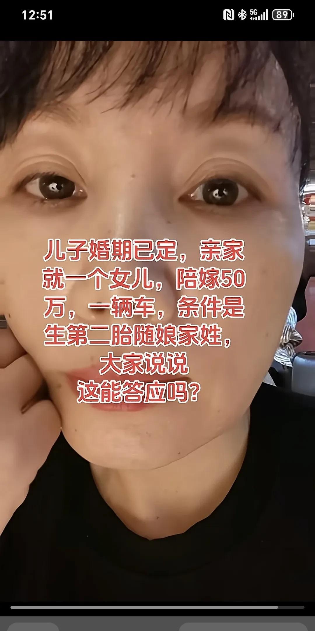 儿子婚期已定,亲家就一个女儿家,陪嫁50万,一辆车,条件是生第二胎随娘家姓,大家说说,这能答应吗? 纠结什么?孩子不管是随爸爸姓还是随妈妈姓都是自己的后代,只要他们美满和睦就行,老不管少事。 我感觉只要小俩口感情好,孙子跟俩边谁姓都可以,就是跟他姥姥姓,也是我儿子的孩子,我的孙子,有什么可纠结的。 女方已经很礼貌了,陪嫁那么多钱不说,人家说二胎随娘家姓,这要是我的话,一胎就随娘家姓。 为啥子不可以,亲家只要求二胎跟妈妈姓,已经很通情达理了,孩子是妈妈的,也是爸爸的,为啥子必须一定要跟爸爸姓才行呢[比心][比心][比心]#孩子跟谁姓都一样#