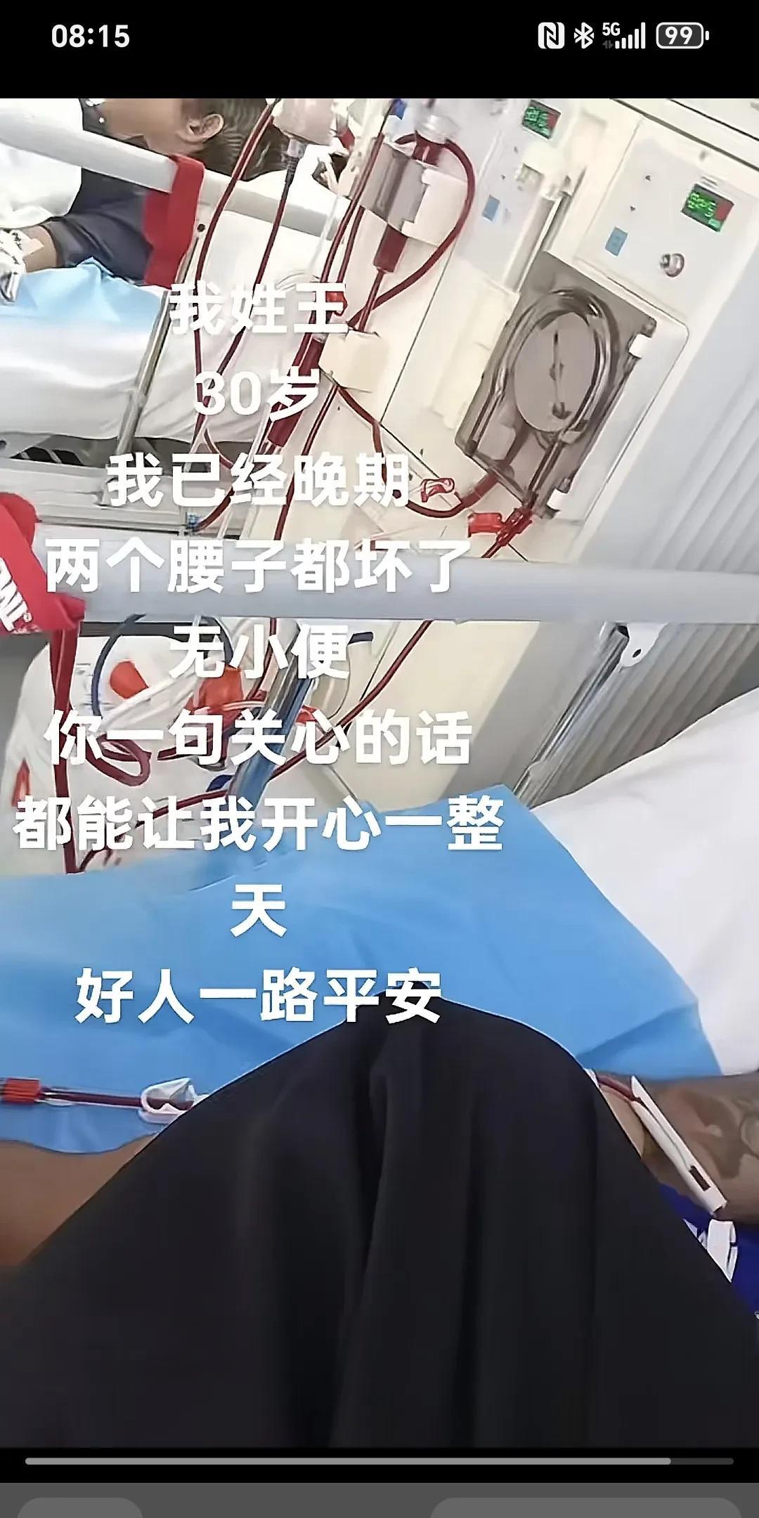 我姓王,30岁,我已经晚期了,两个腰子都坏了,无小便,一句关心的话都能让我开心一