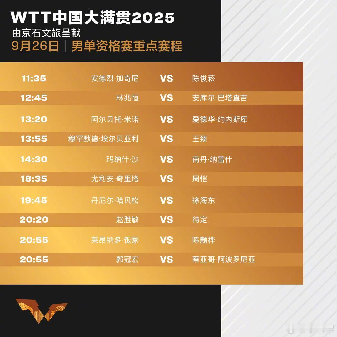 2025年WTT中国大满贯9月26日赛程!
