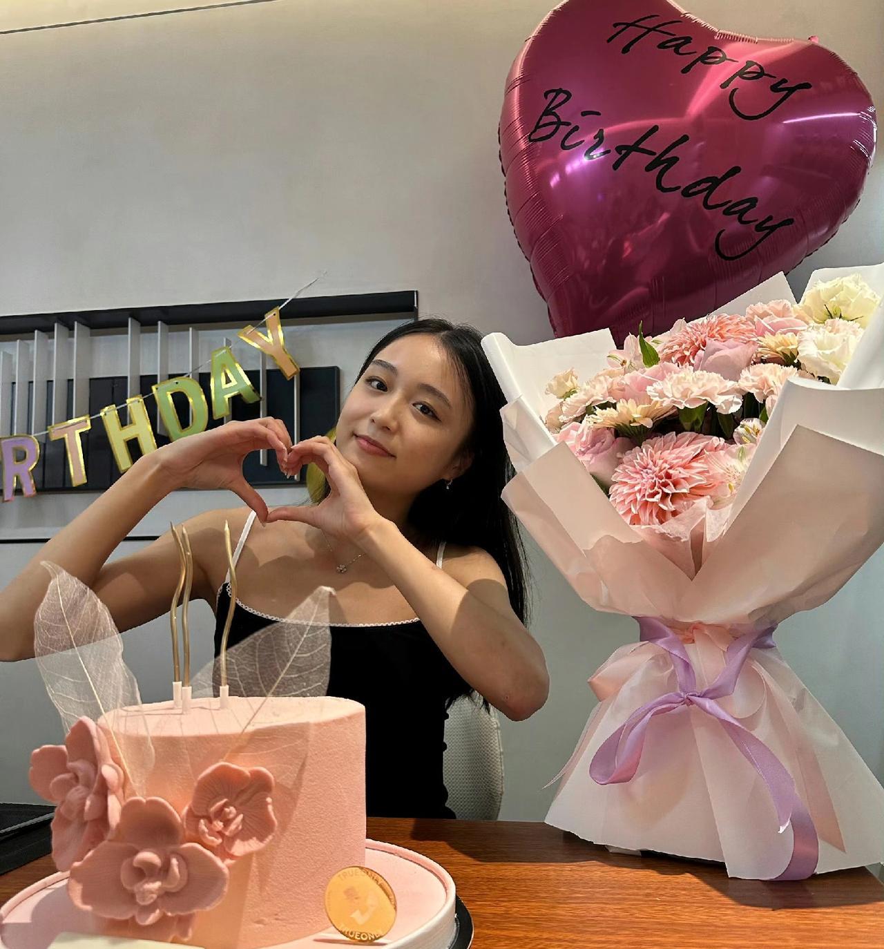 朱易晒出生日照片,其中有款蛋糕上,写着:happybirthdaymyba