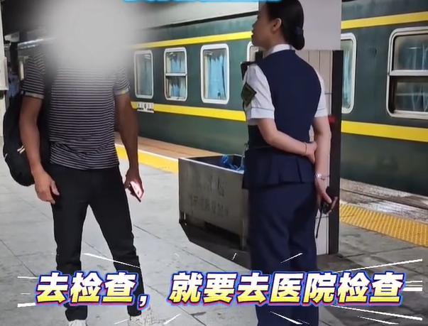 湖南,火车站内,一位男子站在列车台处候车。这时,一名男乘客跟女列车员搭讪问路,听