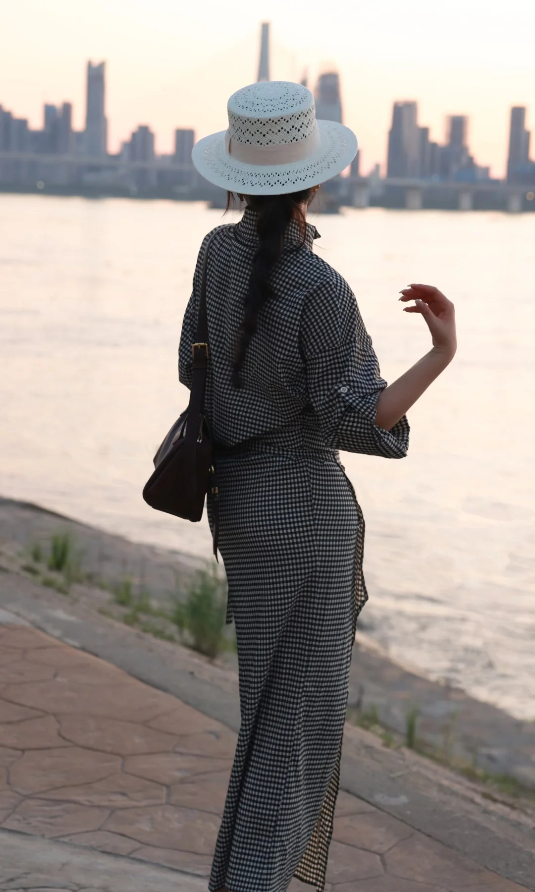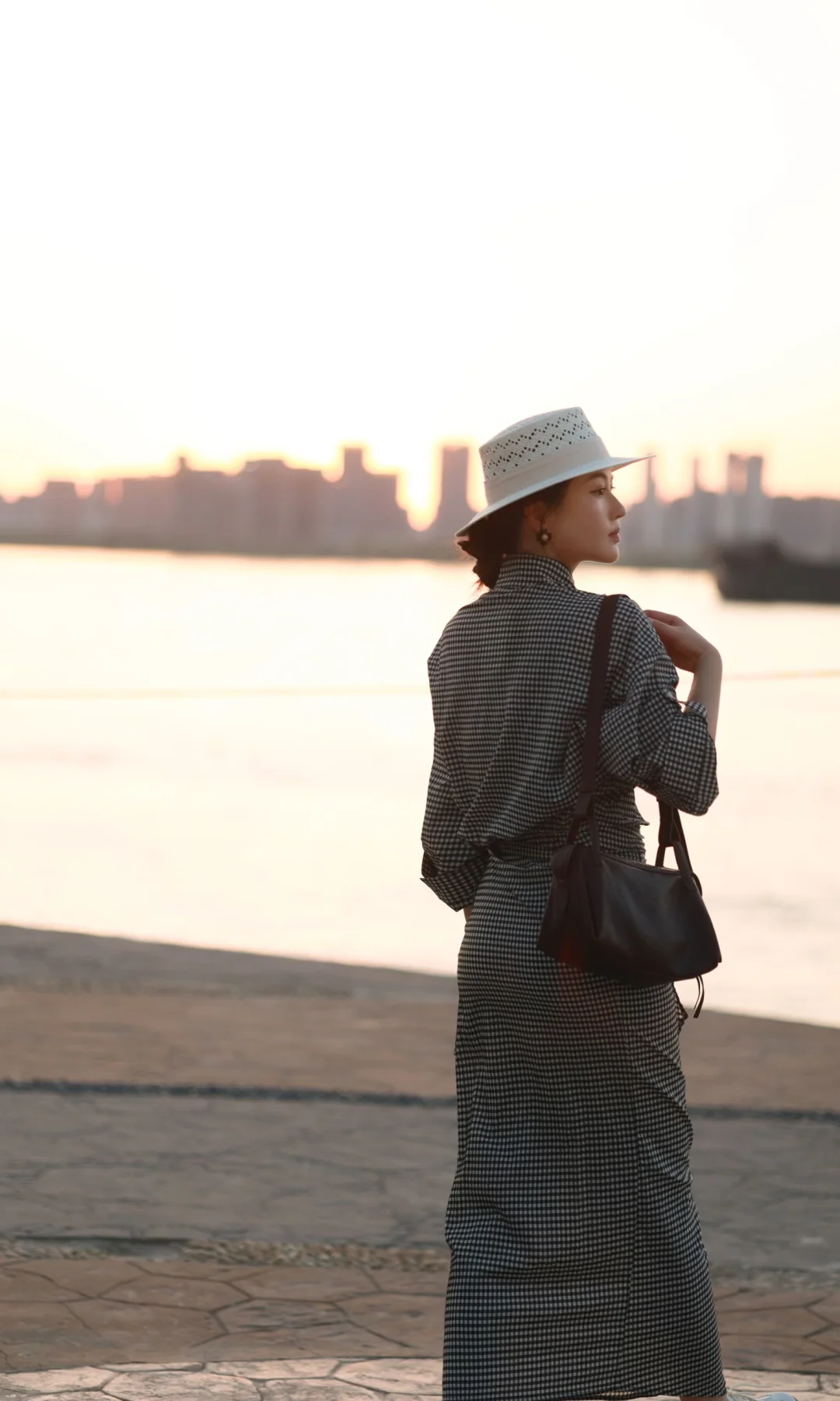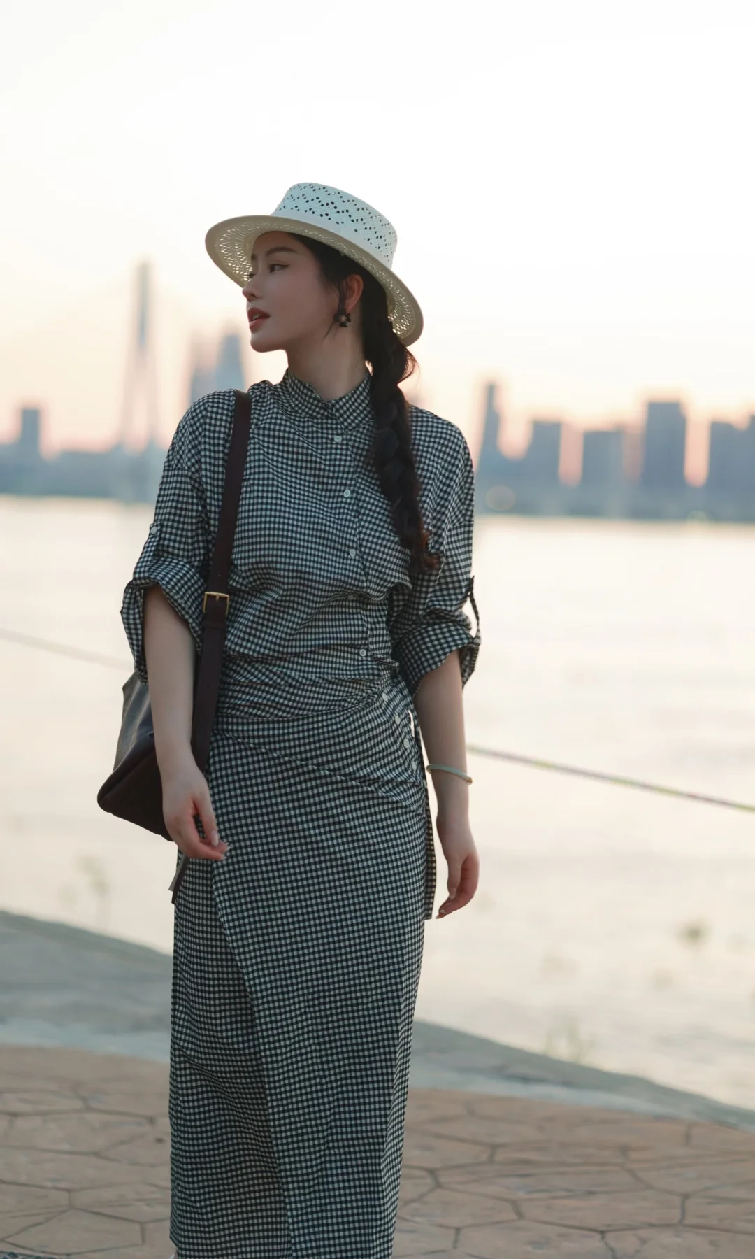 🎹细密的黑白格纹,宛若一张微缩的城市棋盘,复古而冷静。腰线是整身的风眼,被巧妙地裁出一道利落的褶痕,由一根同料细带轻轻束起;它不言不语,却分明勾勒出向上的比例,让裙摆的流淌有了起点。