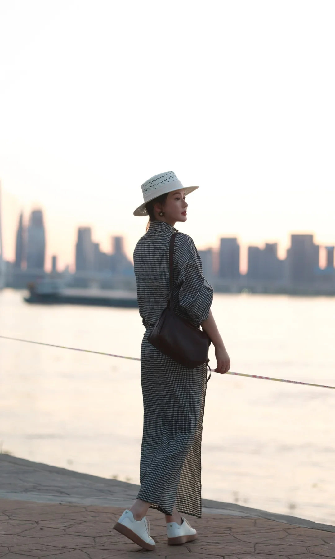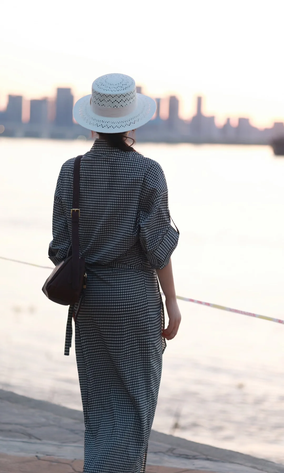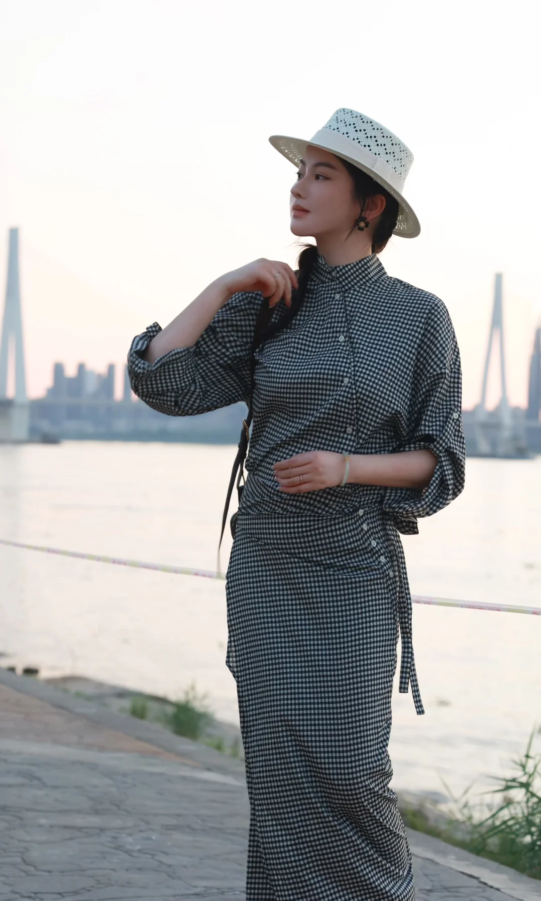 🎹细密的黑白格纹,宛若一张微缩的城市棋盘,复古而冷静。腰线是整身的风眼,被巧妙地裁出一道利落的褶痕,由一根同料细带轻轻束起;它不言不语,却分明勾勒出向上的比例,让裙摆的流淌有了起点。