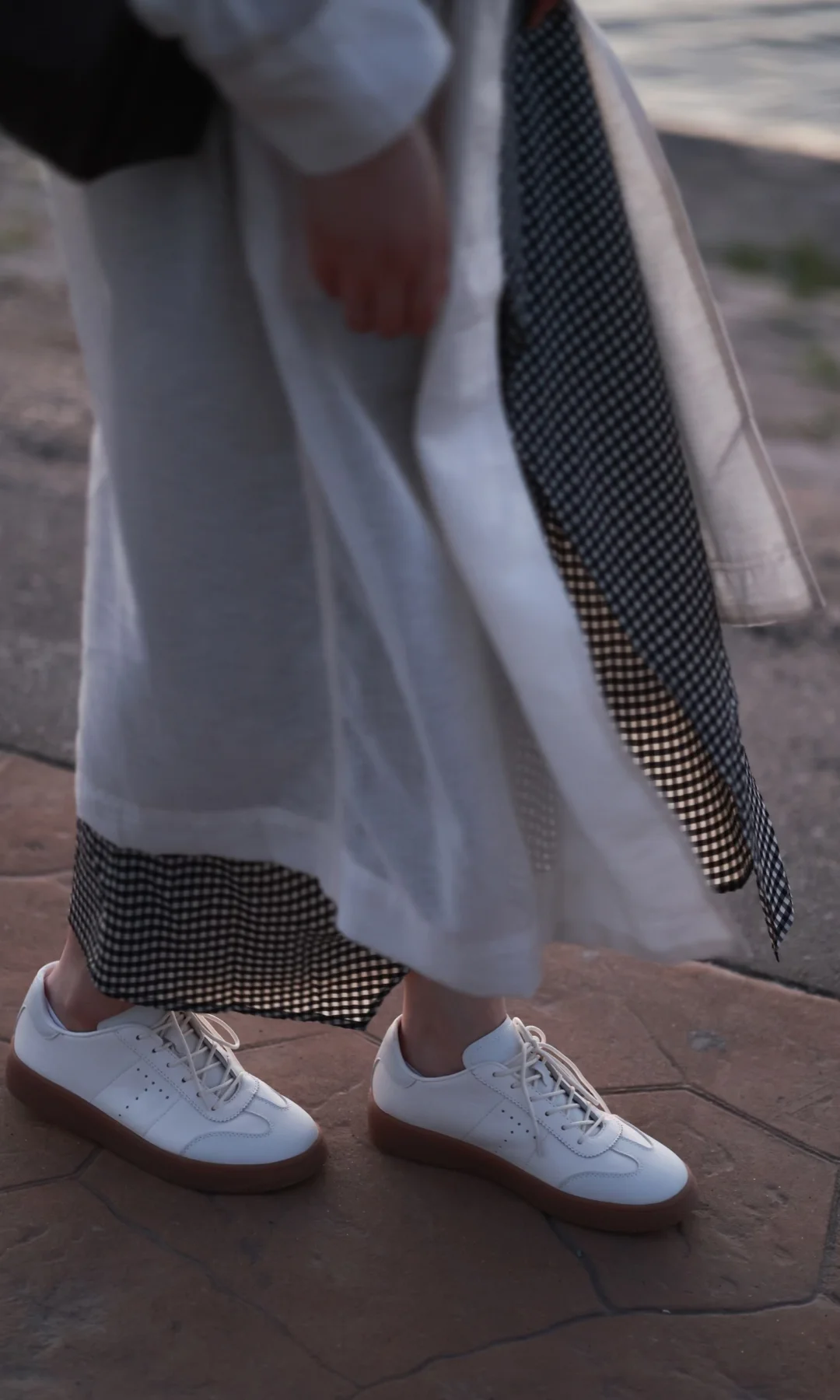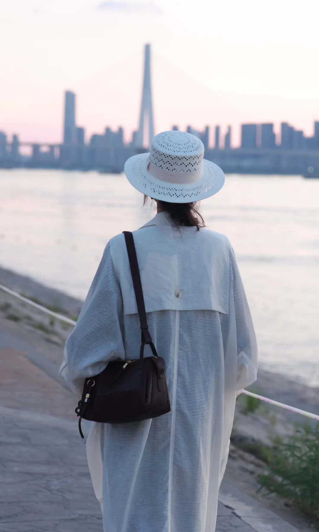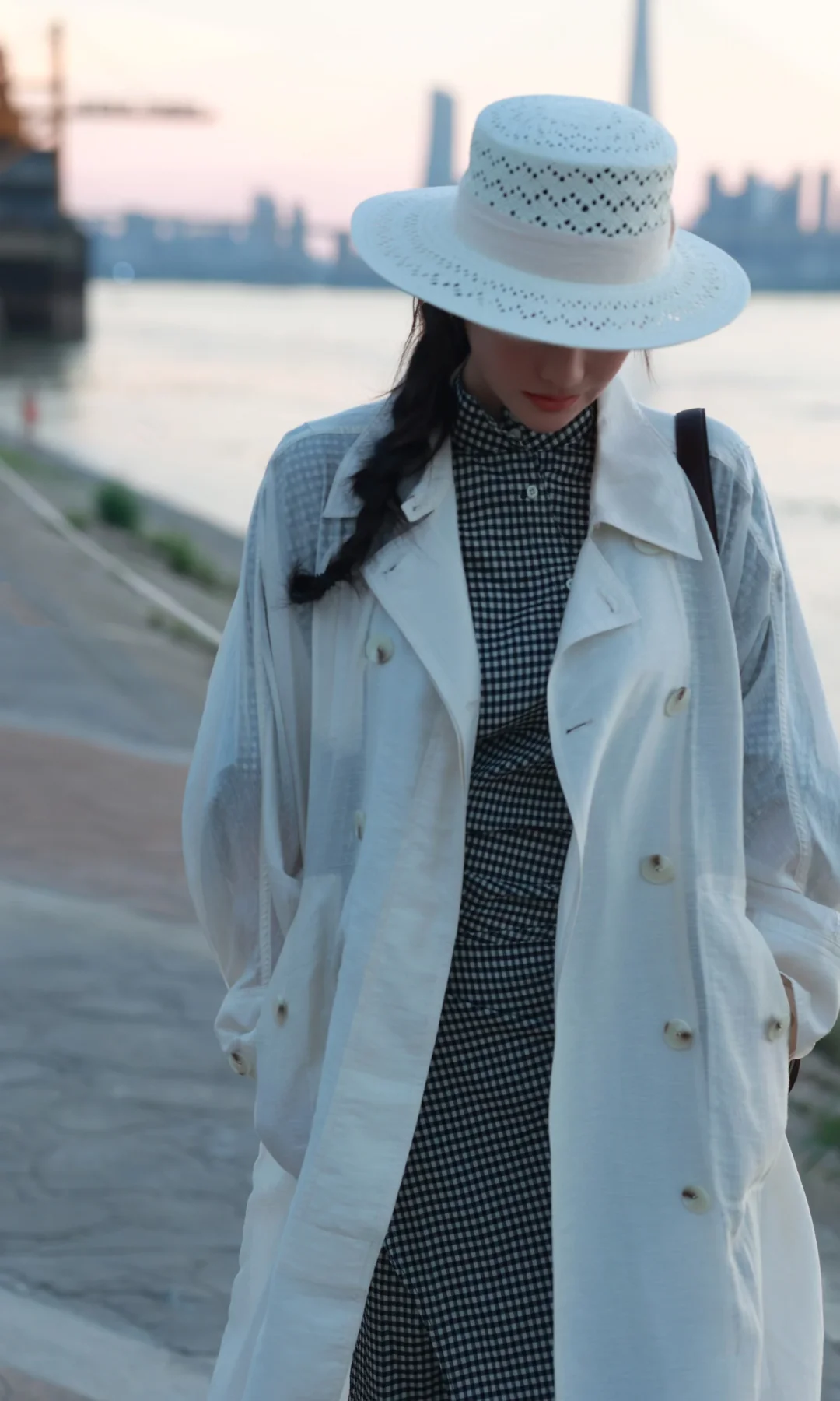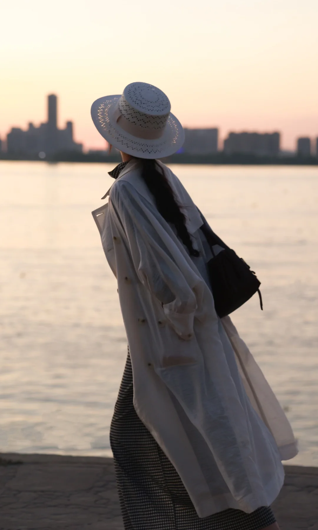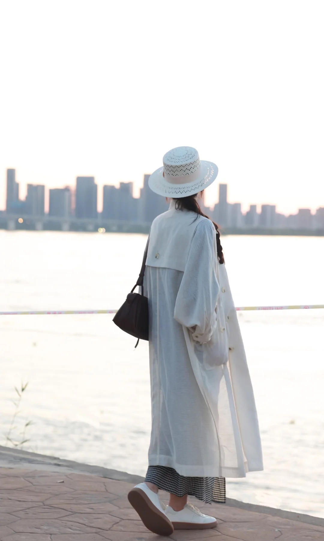 🧥香槟色的亚麻长风衣,写着风与时间的痕迹。亚麻略带粗砺的肌理,在光线下游走明暗,藏匿着呼吸感。宽松的廓形与连衣裙的收腰形成对比,呼应着衣摆与裙长的错落。