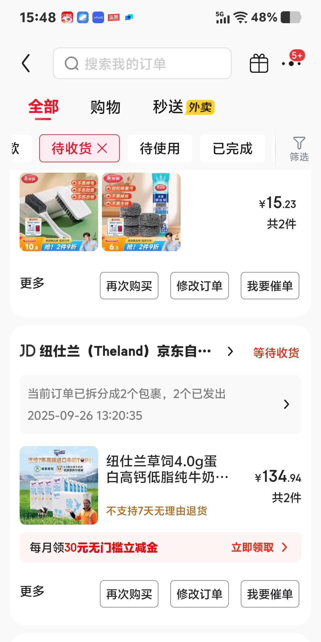 早上准备下单的纯牛奶,一箱90元,我试着买两箱看看多少钱? 不看不知道啊,买2箱