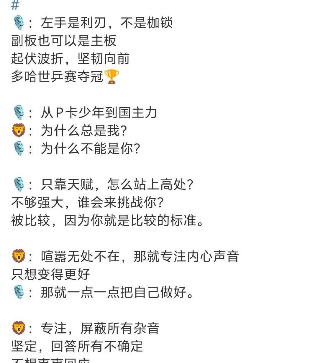 奔驰眼中的王楚钦,原来是这样的。 以你对王楚钦的了解,如果让你写100字的小作文,你会怎么写他? 看人家奔驰,这妥妥的是语文课代表呐。 其实不需要什么花哨的语言,也不需要什么煽情的气氛, 最真实的就是最感人的,最平淡的每日陪伴就是最长情的告白。 奔驰和王楚钦,都遇到了最好的彼此。 缘分到了,就互相成就吧。