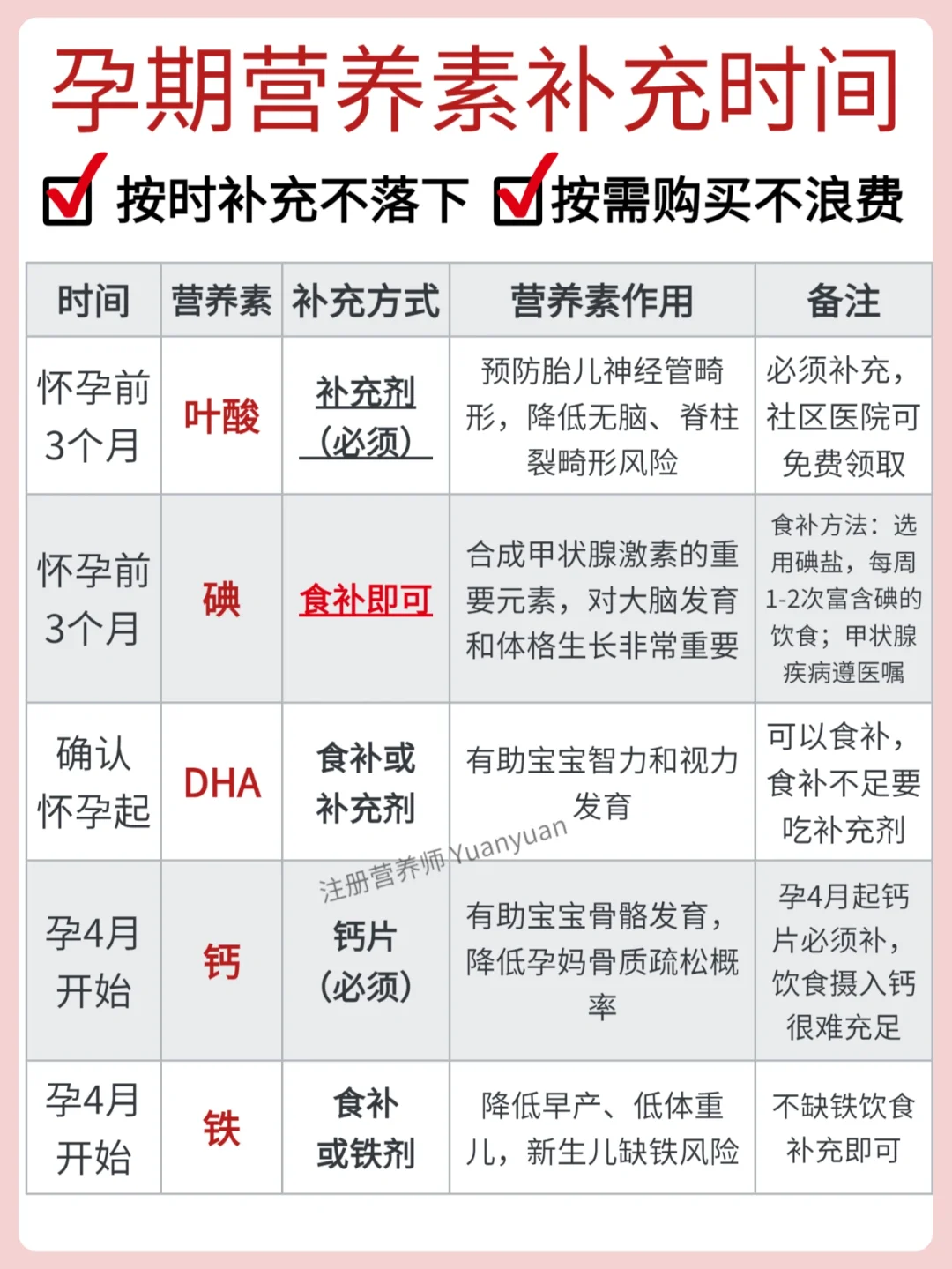 🔺钙:膳食均衡,可以从怀孕第四个月开始吃钙片(必须,1000mg钙饮食很难达到);膳食不均衡,建议备孕或者怀孕时开始吃钙片;孕吐严重孕早期开始吃。