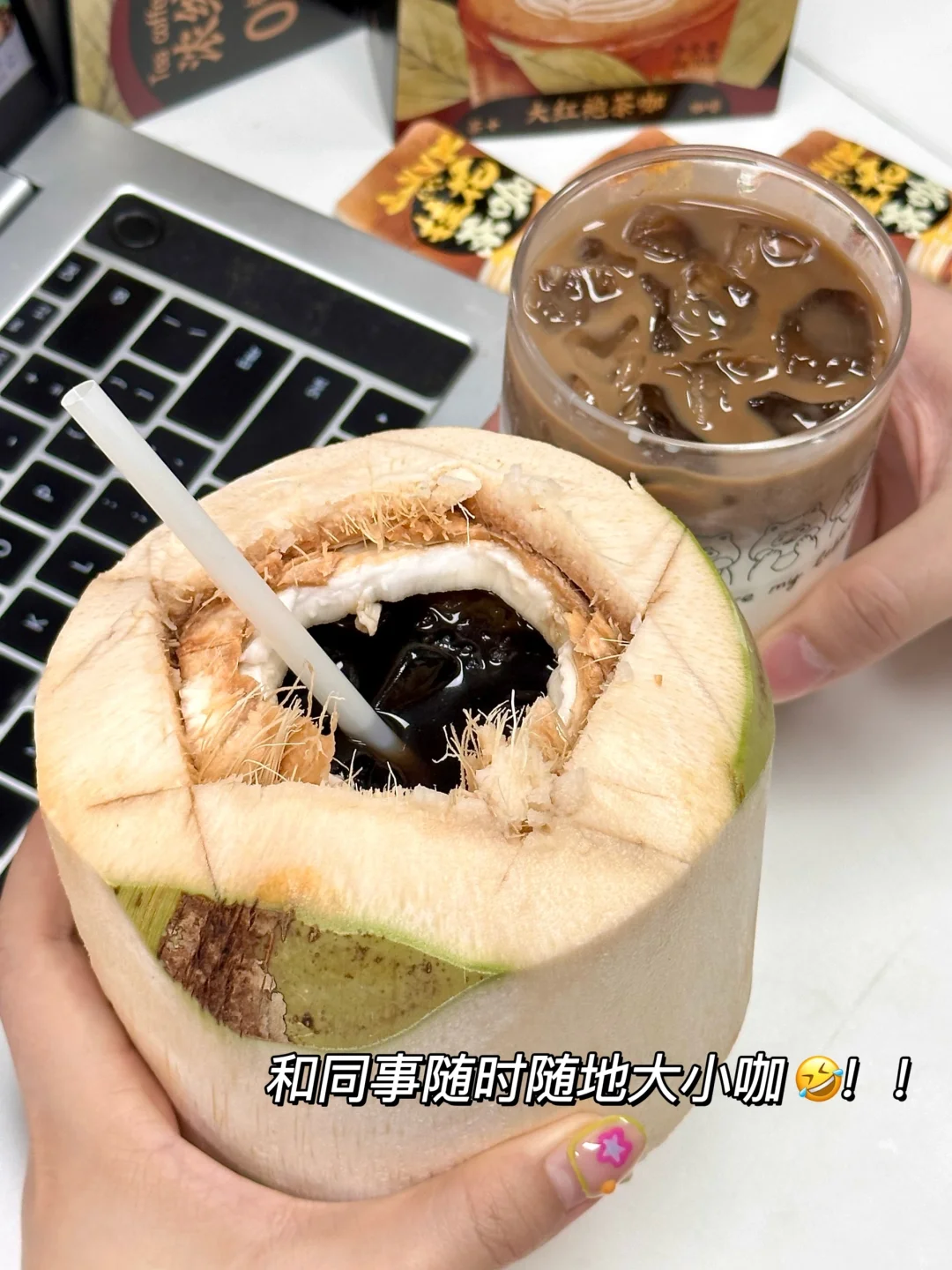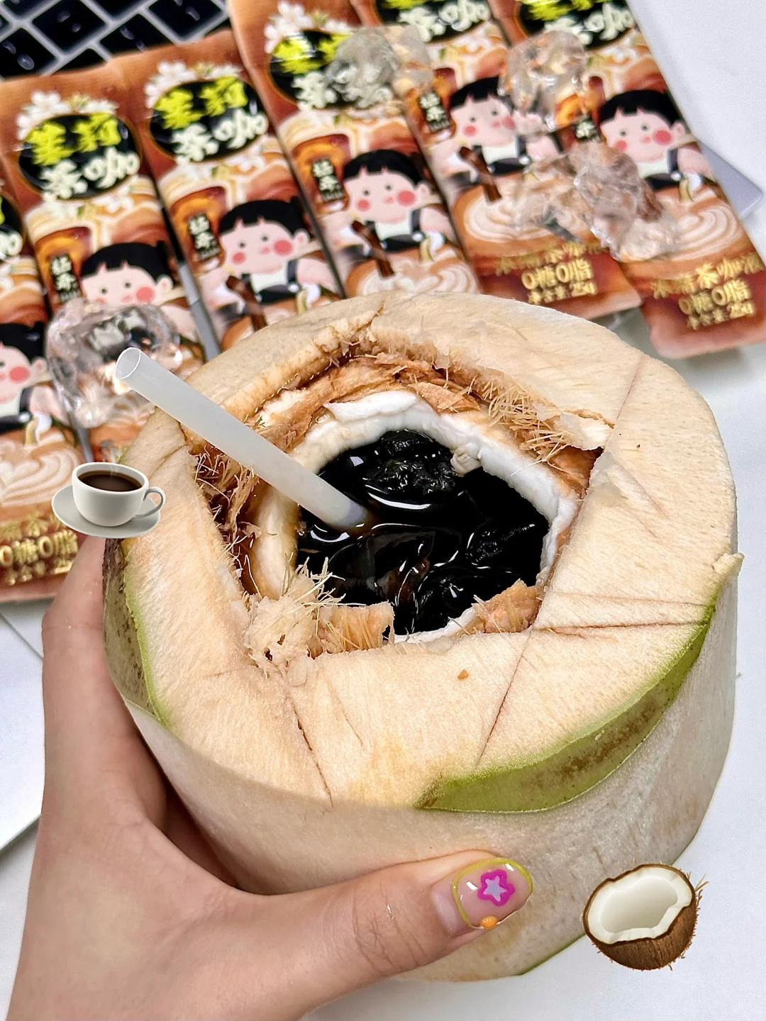 先吸一口沁甜冰爽的椰汁!然后让咖啡液慢慢下沉渗透…