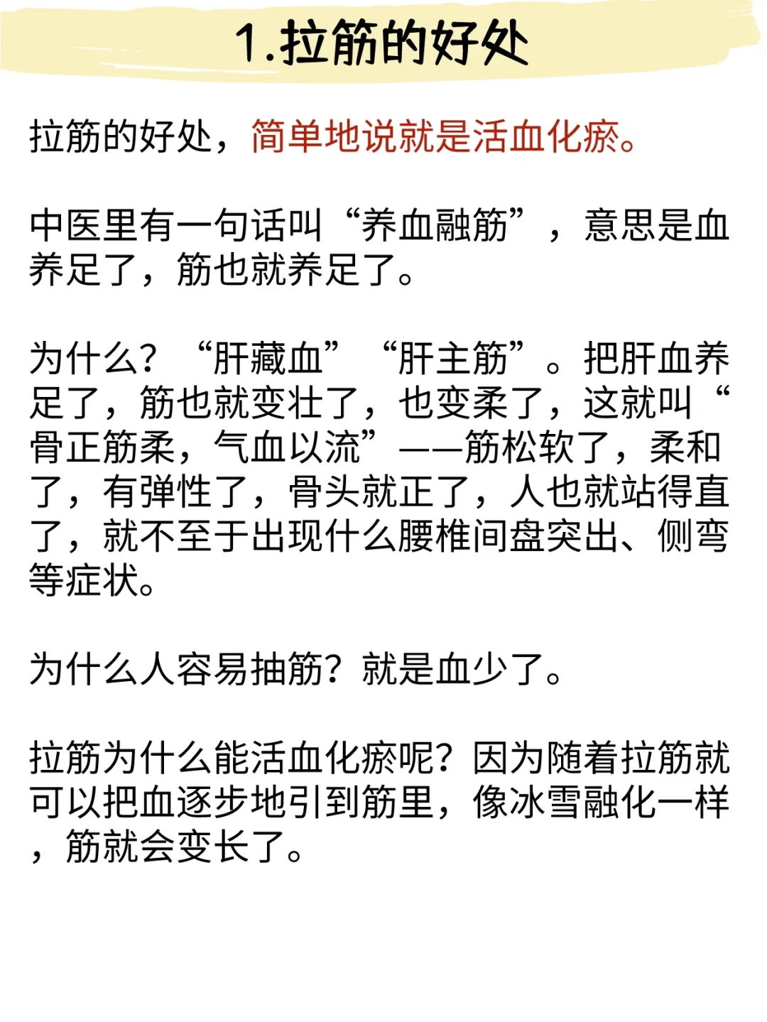 拉筋好处太多了。除了大家知道的增加身体柔韧度外,拉筋更重要使气血流通,从这个角度讲拉筋是延缓衰老、保持健康的健身妙法之一。老年人之所以活动不便,易于疲劳,就是因为年老气血亏虚,筋失所养。