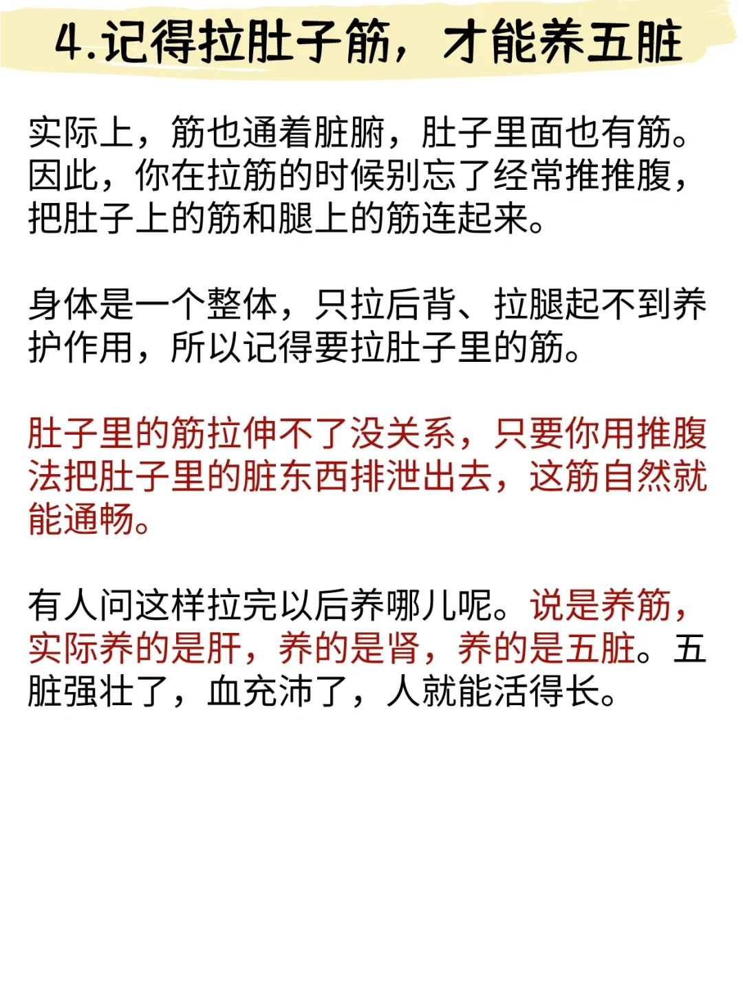 平常运动会做拉伸,但没有把拉筋纳入到每天的养生中,特别是还要拉肚子上的筋,以前真没注意到,现在开始学起来