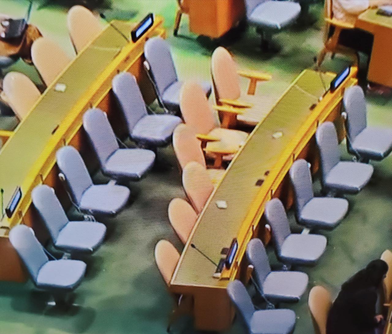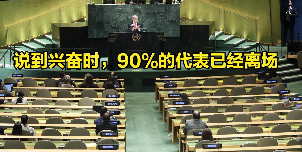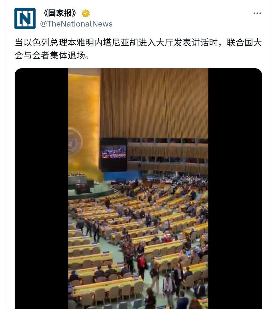 还没开始演说,就被台下狂嘘,内塔尼亚胡在镜头前明显惊慌失措: 今天的联大轮到以色列上台,以色列的内塔尼亚胡演说内容,竟然吹嘘以色列最近如何除掉伊朗的核科学家,以及保证黎巴嫩每一家的厨房拥有一枚以色列导弹,每一户的车库拥有以色列的一枚火箭弹。 要说乌克兰的泽连斯基昨天只需面对空荡荡的坐席,那今天的内塔尼亚胡则要面对大批联合国代表怒气冲冲地撤离大会堂,留下来的其他代表还在不停嘘他,同时给予勇敢退场的代表有节奏的掌声——哪怕联大发言人需要不断地提醒“保持会场秩序”。 可这不是混乱的秩序,这是良知。