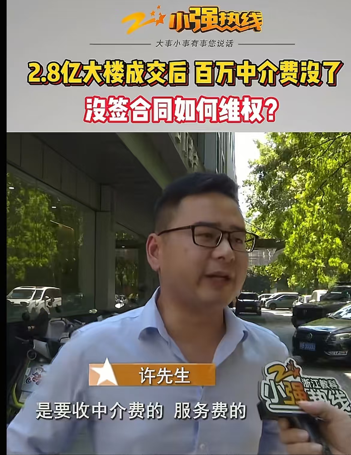 浙江杭州,房产中介带客户成交2.8亿的大楼后,说好的百万中介费却没了!中介:“当时只是口头约定,没有签合同,没有想到这么大的老板会不认账……”网友:你要个15万估计到手了,你要个200万有点过了!