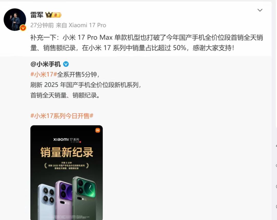 据传,小米17 ProMax单款机型打破今年国产手机全价位段首销全天销量、销售额纪录。 恭喜! (小字:放心啦,我就这么真诚,不耍弄人)