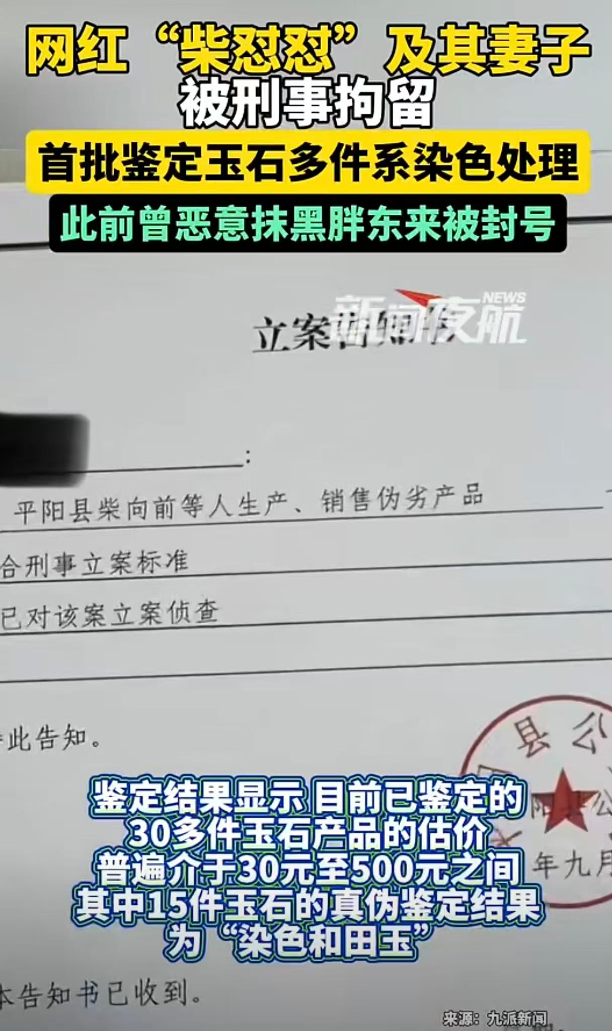 笑死人!蔡怼怼自己一身破烂,竟有脸指责别人衣冠不整! 此前多次在网络平台上,声称要揭露胖东来卖玉石获“暴利”的网红蔡怼怼,连同他的妻子肖某被平阳县公安局刑事拘留,原由是:涉嫌生产、销售伪劣产品。据悉,警方对其涉案首批玉石饰品的价格鉴定和真伪鉴定结果显示,目前已鉴定的30多件玉石产品的估价普遍介于30元至500元之间,其中15件玉石的真伪鉴定结果为“染色和田玉”。 真是,自身作假,反污别人不诚信!所幸,法网恢恢,疏而不漏! 来源:九派新闻,图片截自新闻夜航