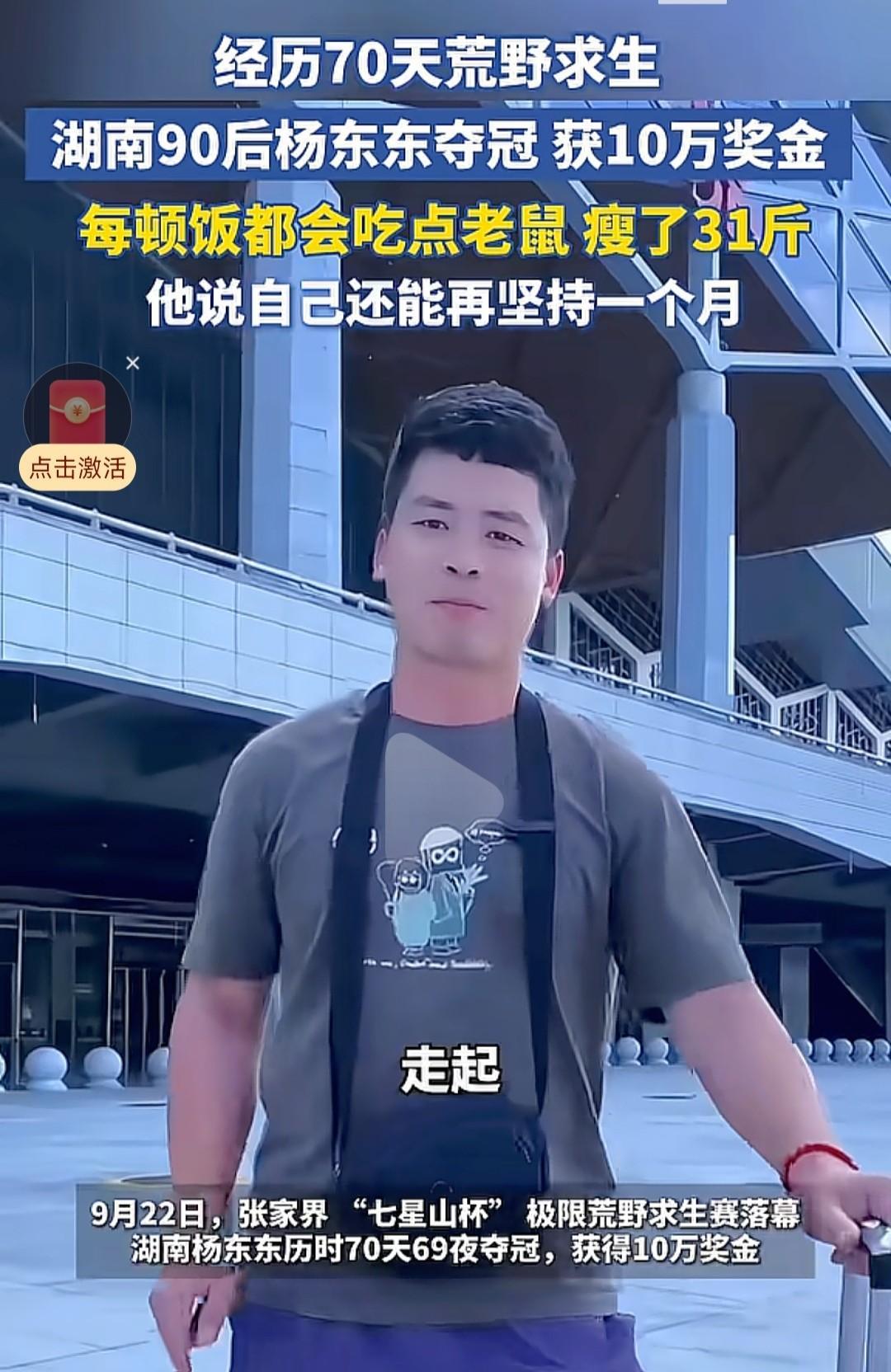 熬到节目组和对手都熬不住了,声称还能再熬一个月的湖南小伙,经历70天荒野求生夺冠,还背回50斤野果,把节目组都吓到了。 9月22日,张家界“七星山杯”极限荒野求生赛落幕,湖南90后小伙杨东东以70天69夜夺冠,获得10万奖金。 网友在羡慕10万奖金的同时,更羡慕他瘦了31斤,而且血压血糖,身体各项指标都正常,似乎头发也变浓密了。 杨东东下山还背回了50斤野弥猴桃和没吃完的老鼠,看他的精神状态,他说的“王大励不退赛,我还能坚持一个月”的话一点不假。 杨东东能夺冠得益于童年和爷爷上山打野的经历和一张不挑食的嘴。 他会钻木取火,只需几分钟就能淡定生火。会制作陷阱,多次成功捕获老鼠,将老鼠洗干净熏干保存起来。会编鱼蒌捕蟹,再配合山中的糯米藤,鱼腥草,山药等植物,保持每餐荤素搭配。所以他还精力旺盛,能背回50斤重的猕猴桃。 再看亚军王大励,由于天天吃野菜,人瘦到脱相,双腿打颤,血糖血压都低,说话都有气无力,双方实力已见高下,再熬下去会出问题。 王大励虽然与冠军擦肩而过,也很有收获,许多网友都佩服他的毅力。他不仅获得了6666元奖金,七星山旅游公司决定每月给他的孩子赞助600元助学金,直至他的两个孩子高中毕业。 很多网友说,我也想参加,不为别的,纯粹为了减肥。 从这两人身上可以看出来,一般人真没这毅力,也没这种识野菜野果的知识量,更没有取火和觅肉食的本领,补充不到身体必需的能量,盲目进山只会是冒险,随时会有生命危险。 从俩人身上看出了现在年轻人身上所缺少的优秀品质,吃得苦,有毅力,耐得住寂寞,还有强硬的极限求生本领。