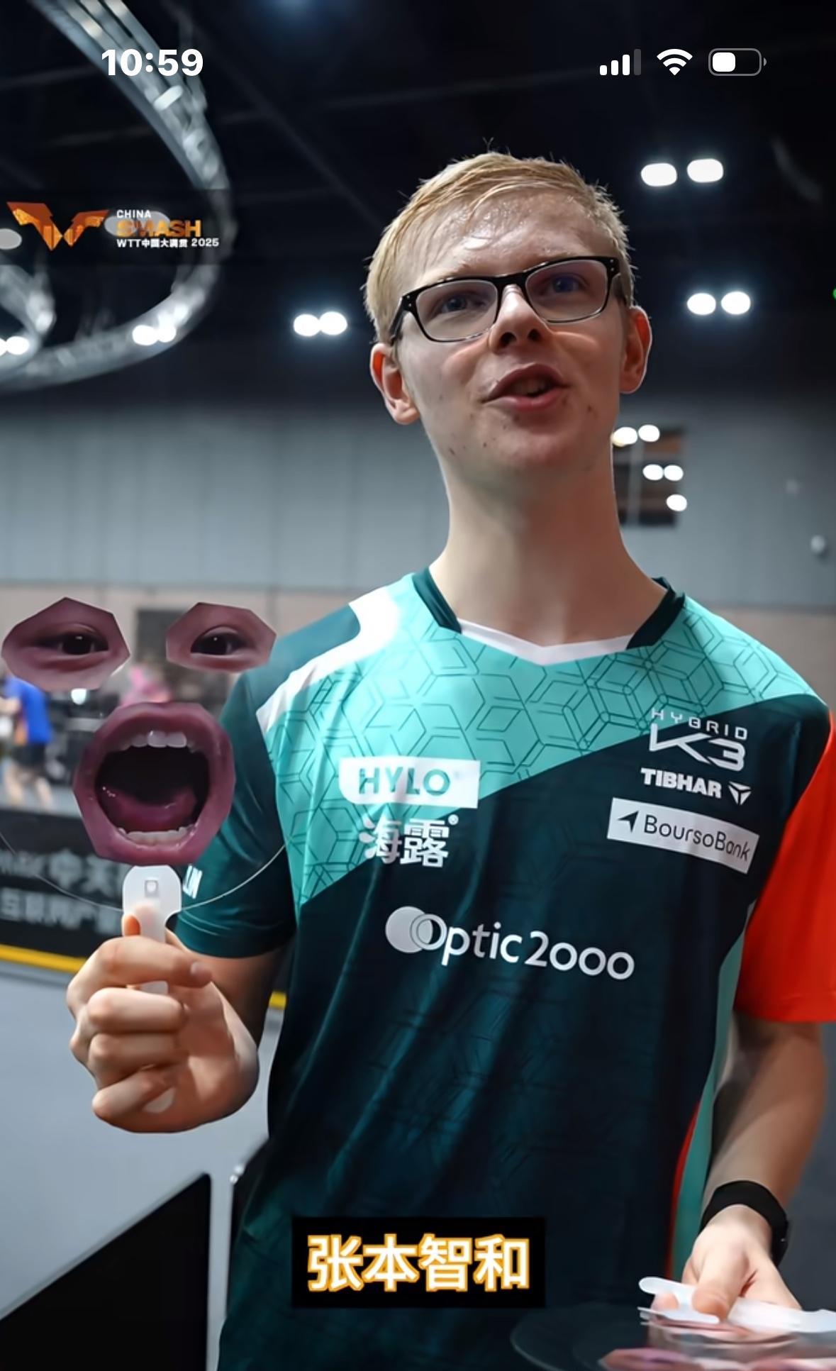 WTT世界乒联在北京大满贯 的训练场,进行了趣味认球员活动, 佩服小勒布伦的认人能力, 一个透明的小扇子, 有些人我都没有认出来, 他在比赛中, 一定观察到每一个运动员! 肯定不是脸盲! 这个扇子是谁想出来的, 好抽象! 连蒯曼都认识, 看到画有王楚钦眼睛和嘴巴小扇子, 一下子就笑出来啦, 小布一眼认出,特定很强啊! 张本智和的头像最可笑, 小布还放到自己脸上比一下, 太可爱啦!