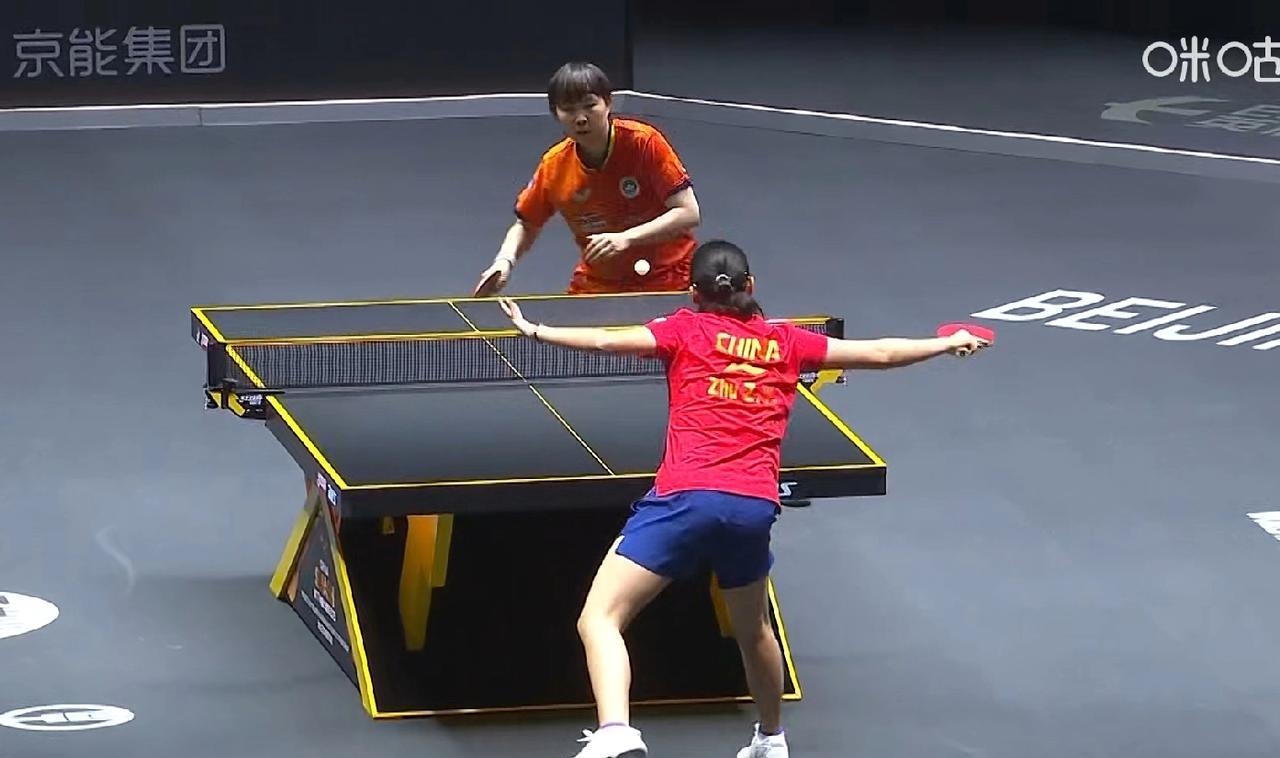 小朱打得不错,虽然第一局8-11不敌老朱,但在场上一点不怯场,敢打敢拼。 不管输