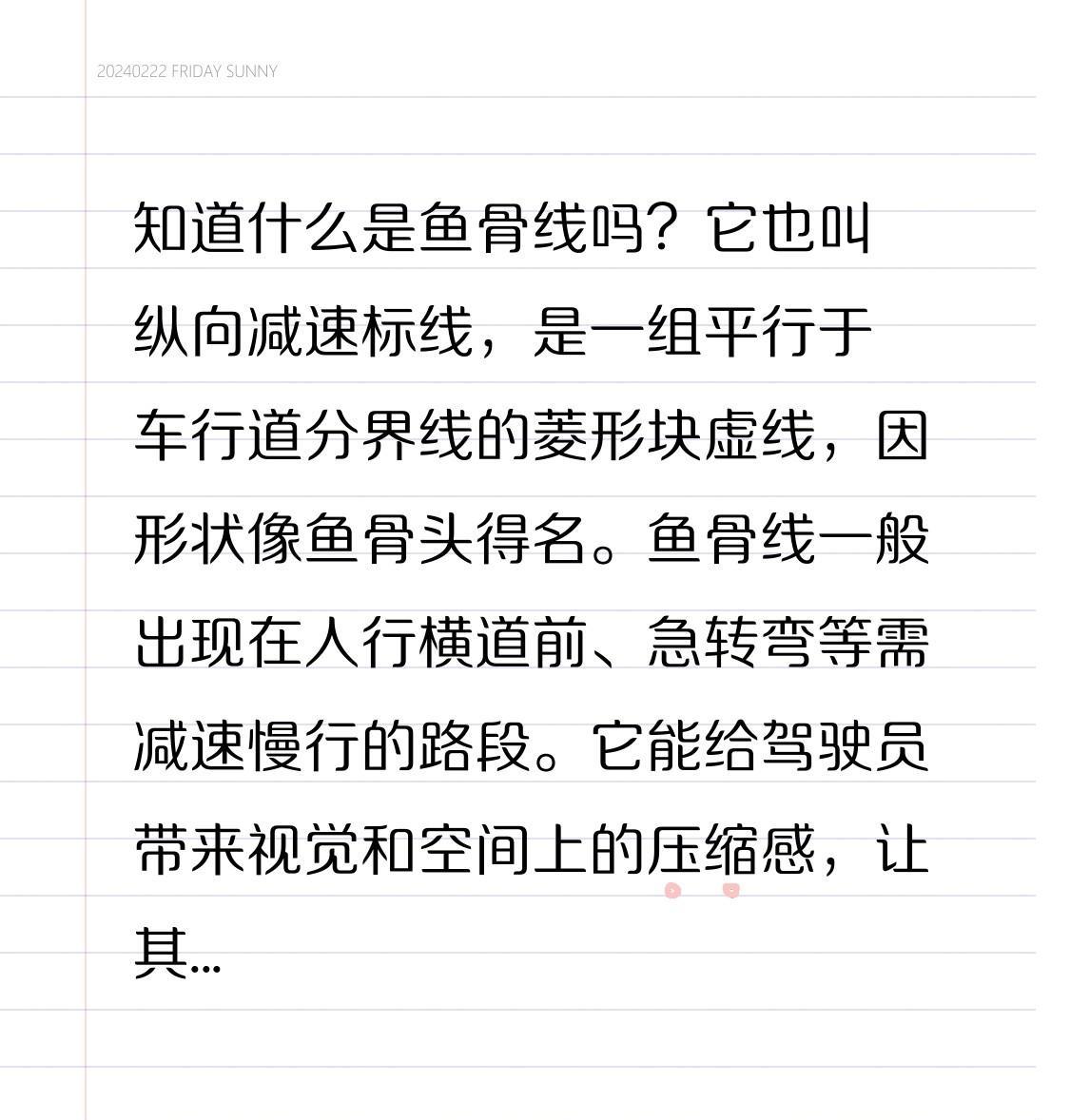 知道什么是鱼骨线吗?它也叫纵向减速标线,是一组平行于车行道分界线的菱形块虚线,因形状像鱼骨头得名。 鱼骨线一般出现在人行横道前、急转弯等需减速慢行的路段。它能给驾驶员带来视觉和空间上的压缩感,让其本能减速。遇到鱼骨线,要提前减速,保持车距。若中间是实线,禁止变道;虚线则允许变道,但仍要观察路况。养成“见线即减速”的习惯,才能安全通行。