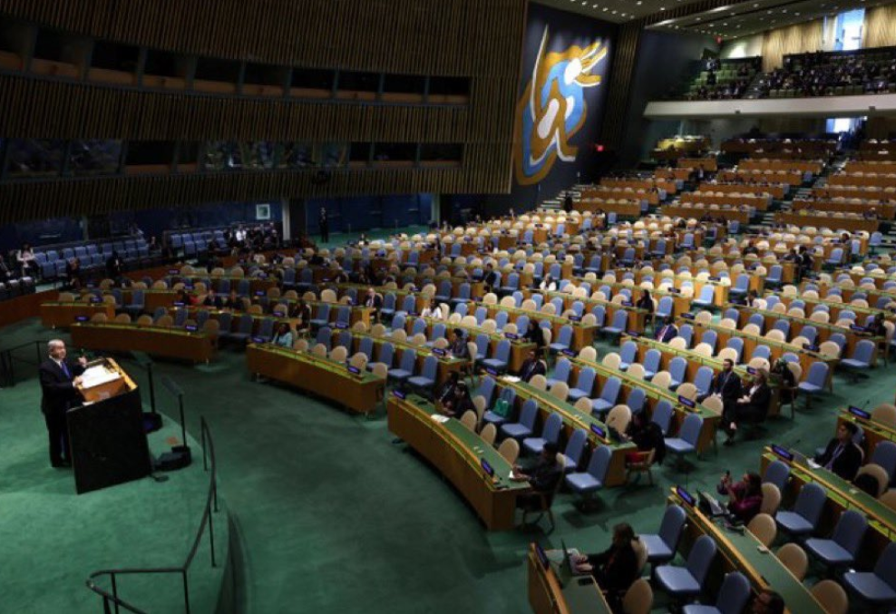内塔尼亚胡在联大发表演讲时,很多代表退席了,这就是现场情景。感觉除了一些助手和记