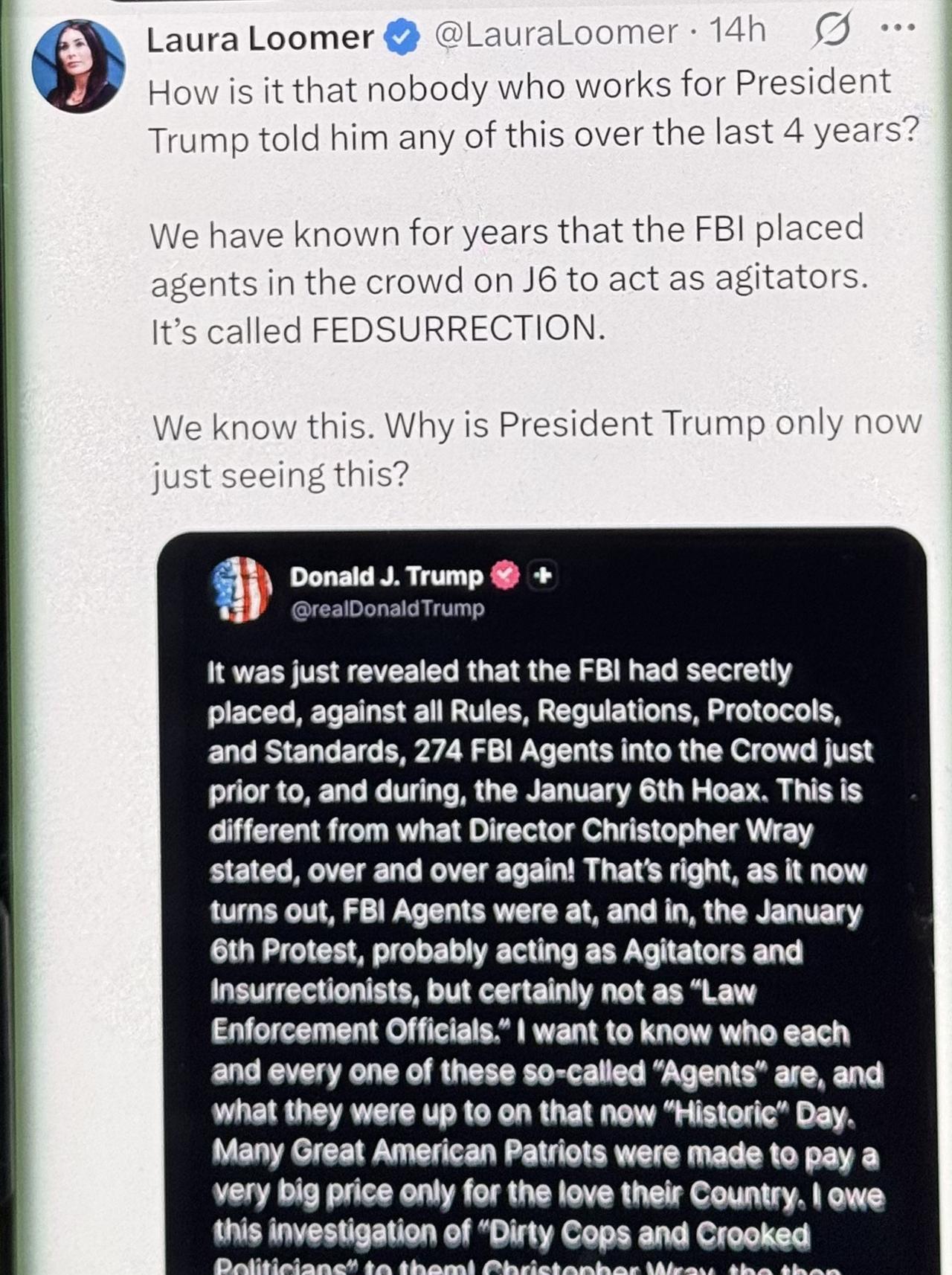 惊爆!重磅消息!全球媒体包括社交媒体都吵翻天了!在过去的四年里,为什么没有一个为特朗普总统工作的人告诉他这些?多年来,我们都知道联邦调查局在6号公路上的人群中安排了特工充当煽动者。这叫做联邦监管。我们知道这个。为什么特朗普总统现在才看到这一点?——劳拉·卢默-劳拉洛默调查记者 自由精神的创始人!