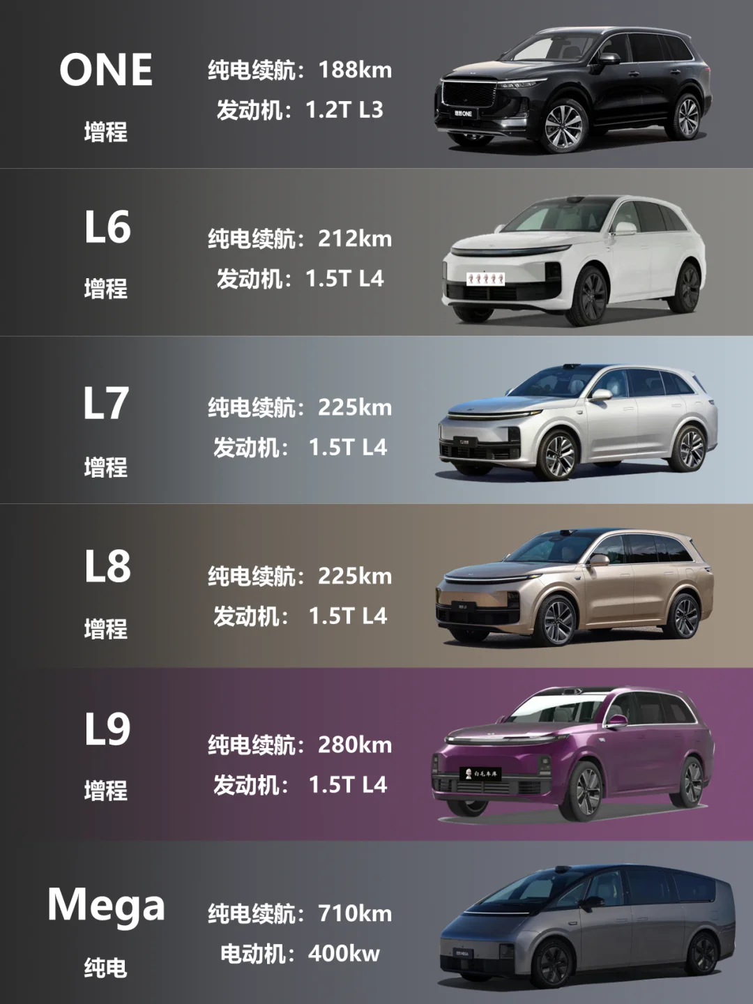 理想L6:定位于家庭豪华五座的中大型SUV,车长控制在五米以内,城市驾驶更灵活,售价24.98万元至27.98万元,适合年轻家庭和预算有限追求性价比的用户