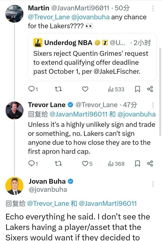 湖人补强梦碎?76人弃将场均21+5+4,要价2500万却因土豪线无缘联手詹姆斯东契奇 据最新消息,76人队确定不会延长格雷姆斯的资质报价期限,这位实力派后卫顿时成为市场焦点,当球迷询问湖人是否可能出手时,两位湖人跟队记者同时泼来冷水——“几乎没机会”! 格雷姆斯数据亮眼,要价引发争议 上赛季中期加盟76人后,格雷姆斯打出生涯最佳表现: · 场均21.9分5.2篮板4.5助攻 · 三分命中率37.3%,投篮命中率46.9% · 出场时间高达33.7分钟,展现全能身手 目前格雷姆斯团队寻求年薪2500万美元的合同,而联盟多位管理层认为他的合理价位在1500万美元左右。 湖人为何无缘签约他? 第一薪资空间锁死:湖人已非常接近第一土豪线,无法直接签下自由球员 第二缺乏交易筹码:即便76人交易格雷姆斯,湖人也难拿出对方想要的资产 第三竞价处于劣势:其他球队的报价很可能超过湖人 格雷姆斯若加盟湖人能为湖人带来什么? 理论上,格雷姆斯的外线火力和组织能力正是湖人需要的,他既能担任第二持球点,又能提供稳定的三分威胁,可惜,薪资规则让这笔潜在补强只能停留在想象阶段。