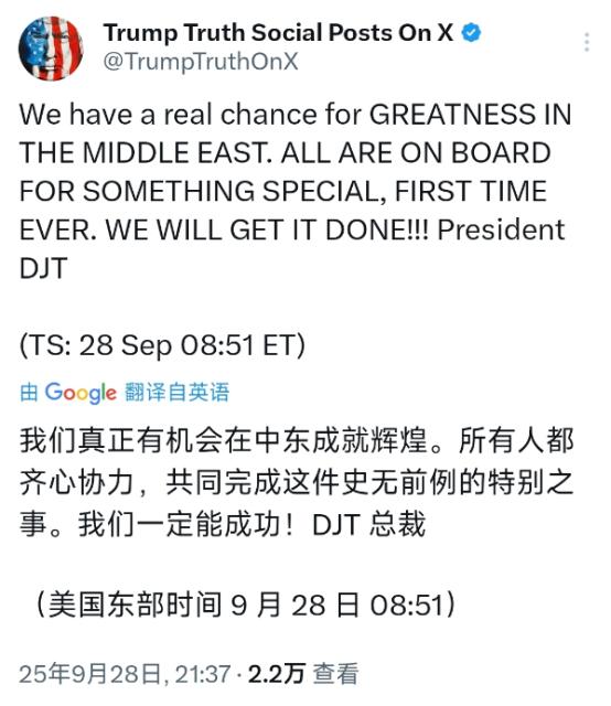 美国总统特朗普北京时间9月28日晚发文写道:我们真正有机会在中东成就辉煌。所有人都齐心协力,共同完成这件史无前例的特别之事。我们一定能成功! 特朗普这话听着口气不小,成就辉煌”“史无前例”,说白了就是在给自己的中东操作吆喝造势。 要搞懂他这话的底气在哪儿,得先扒扒他发这条文前后的动作,还有中东那摊子里藏着的各种门道,这些都不是空口白话,全是有实打实的事儿跟着的。 北京时间 9 月 28 号特朗普发文这晚,距离他跟埃及、沙特、卡塔尔等 8 国领导人开会刚过去 5 天。 9 月 23 号那回会谈可不一般,特朗普直接抛出了所谓的21 点中东和加沙和平计划,核心就是要释放所有被扣押人员、实现永久停火,还得给加沙搞个没哈马斯的治理框架。 能把这么多中东国家的头头凑一块儿,本身就够特朗普吹一阵的,这也是他说所有人都齐心协力的由头 —— 毕竟这些国家愿意坐下来听他聊,就给了他能成事儿的错觉。 但这里面的门道深了去了,哪是 “齐心协力” 那么简单。阿拉伯国家领导人当场就给特朗普提了条件:想让我们认你这计划,以色列就得放弃吞并约旦河西岸,不然之前签的《亚伯拉罕协议》就得黄。 要知道《亚伯拉罕协议》可是特朗普第一个任期的得意政绩,当年撮合阿联酋、巴林跟以色列建交,让他吹了好几年,现在沙特这阿拉伯世界的 “领头羊” 还没搞定,要是老协议崩了,新计划更没戏。 所以特朗普立马拍胸脯承诺,绝对不让以色列吞并约旦河西岸,这话既是给阿拉伯国家吃定心丸,也是在给自己的 “辉煌” 铺路。 他嘴里的史无前例的特别之事,说白了就是想把沙特拉进和以色列建交的圈子里。 之前美国一直撺掇沙特跟以色列关系正常化,还设计了个 “三合一” 协议:美沙签防务条约、沙以建交、给巴勒斯坦建国铺路,这三件事绑在一起,缺一个都不行。 本来那防务条约都谈得差不多了,沙特官员说完成了 95%,可就卡在巴勒斯坦问题上 —— 沙特王储放了话,不按 “两国方案” 给巴勒斯坦建国,想让沙特认以色列,门儿都没有。 现在特朗普抛出停火和不吞并约旦河西岸的承诺,就是想撬开这个僵局,要是真能让沙特点头,那可比之前的《亚伯拉罕协议》风光多了,这不就是他要的辉煌嘛。 可这事没那么容易成,各方的小算盘打得比谁都响。以色列总理内塔尼亚胡 29 号就要跟特朗普见面,他这会儿也头疼得很。 一方面执政联盟里的极右翼死活不让步,觉得给巴勒斯坦让步就是卖国;另一方面被哈马斯扣押的人质家属天天施压,逼着他赶紧签停火协议。 所以内塔尼亚胡表面上说支持特朗普的提议,实际上心里门儿清,真要让以色列实打实给巴勒斯坦好处,国内那关就过不去。 哈马斯那边更直接,说从调解人那儿得到的消息 “特别失望”,根本没进展,还骂内塔尼亚胡故意设置障碍延长战争。 特朗普自己也有本账,他这么急着在中东搞出 “大新闻”,跟美国国内的情况也脱不了关系。之前布林肯都跑了十几次中东了,停火协议迟迟没下文,美国在中东的信誉早就跌了不少。 现在特朗普要是能促成沙以建交加停火,不管是对他的政治形象还是后续的选举,都是天大的加分项。 而且美国一直想在中东搞小圈子,撮合阿拉伯国家跟以色列抱团,说白了就是想建中东版北约,把伊朗、中俄的影响力挤出去,顺便推自己的印度 — 中东 — 欧洲经济走廊,这比单纯的停火协议划算多了。 但这些算计能不能成,还得打个大大的问号。美国在中东的政策从来都是 “谋霸” 优先,之前为了推 “亚伯拉罕协议”,故意把巴勒斯坦问题边缘化,结果引发新一轮巴以冲突,现在又想走老路,哪有那么容易。 中东国家早就不是以前那样听美国摆布了,沙特宁愿放弃有约束力的防务条约,也要搞 “降级版” 的军事合作,就是不想被美国绑死。 而且伊朗、黎巴嫩真主党这些势力也不会坐视不管,之前哈尼亚遇袭后,各方都在担心伊朗报复,万一局势升级,特朗普的 “辉煌” 计划就得泡汤。 不过特朗普这会儿肯定得往乐观了说,毕竟刚跟阿拉伯国家谈完,又给了以色列压力,眼看内塔尼亚胡也松了口说支持提议,难免觉得胜利在望。 特朗普的 “中东辉煌” 本质上还是基于美国霸权的算计,想靠着拉偏架、搞小圈子实现所谓的 “和平”。可中东国家现在更想自己做主,求团结谋发展才是真需求,美国那套冷战思维早就不吃香了。 至于最后能不能成,就得看这一个月里,特朗普能不能把以色列和阿拉伯国家的矛盾捏合住,毕竟内塔尼亚胡和沙特王储的态度,才是决定这出 “大戏” 结局的关键。