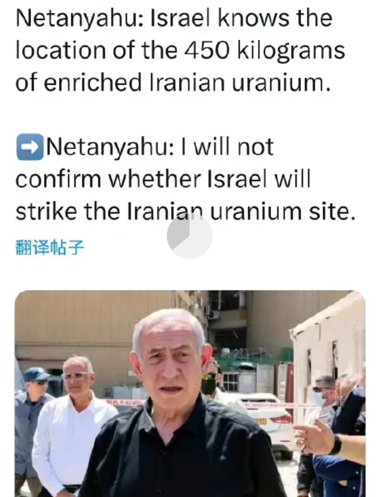 内塔尼亚胡放出风声,随时可能攻击伊朗 450公斤浓缩铀的地点! 内塔尼亚胡表示,以色列已经知道伊朗450 公斤浓缩铀的具体位置,随时会进行攻击。 #伊朗发击以色列# #伊朗以色列状况#