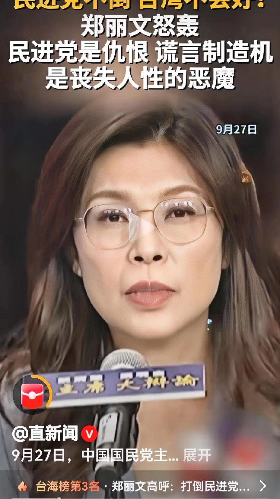 国民党主席候选人郑丽文,怒斥:“民进党是最大的仇恨、谎言制造机”,打着 “爱台湾” 旗号却撕裂社会,将台湾社会搅得只剩立场、没有是非,怒轰“民进党不倒,台湾不会好!”有勇气!有魄力,喊的好,完全正确! 最近台湾政坛因为国民党主席选举热闹起来,其中郑丽文在竞选活动里的一番话,直接把矛头对准民进党,听得不少台湾民众直呼 “说出了心里话”。 郑丽文的政治路,简直像坐过山车。当年,她是民进党力捧的发言人,一度自称“台独”铁粉,对那套理念深信不疑,可时间一长,她嗅出了不对劲,发现“台独”里头藏着欺骗。这让她开始琢磨,自己信奉的究竟是什么。 她站在台北市的竞选造势台上,手里攥着话筒,声音比平时高了几分,一句 “民进党是最大的仇恨、谎言制造机” 刚出口,台下就响起成片的掌声,连路过的行人都停下脚步往这边看。 郑丽文提到民进党 “打着‘爱台湾’旗号却撕裂社会”,这话不是空口说的。就拿去年台湾地区的 “公投” 议题来说,民进党为了拉选票,把原本单纯的民生议题跟 “统独” 绑定,只要有人对政策提出不同意见,就被扣上 “不爱台湾” 的帽子。 有位台南的老农只是建议调整农产品进口政策,就被民进党籍的议员在议会上指责 “帮大陆说话”,最后连自家果园的销路都受了影响。 还有台北市的社区改造项目,因为部分居民对规划有异议,民进党又开始炒作 “地域对立”,把支持改造和反对改造的居民分成两派,到最后项目搁置了大半年,居民们的矛盾却越来越深。 现在台湾社会里 “只剩立场、没有是非” 的情况也越来越明显。前阵子台湾高校里举办一场关于两岸经济合作的研讨会,有学生提到大陆市场对台湾青年创业的帮助,结果马上就有民进党背景的学生团体出来抗议,说研讨会 “有统战倾向”,还在校园里贴满标语,连主讲教授都受到了骚扰。 更让人无奈的是,台湾的公共政策讨论也越来越偏离本质,比如讨论能源政策,本该关注核电安全、绿电成本这些实际问题,可民进党却总把话题引到 “是否依赖大陆能源” 上,到最后政策没定下来,反而让民众分成了 “挺核” 和 “反核” 两派,互相攻击不休。 郑丽文怒轰 “民进党不倒,台湾不会好”,这话背后是台湾民众实实在在的生活困境。就说青年就业吧,台湾去年大学毕业生的平均起薪还不到 3 万台币,比十年前只涨了 1000 多台币,可台北市的房租却涨了近 50%。 不少刚毕业的年轻人只能挤在月租 1 万台币的小单间里,连吃顿外卖都要犹豫半天。而民进党在竞选时承诺的 “青年创业补贴”,到现在能真正拿到手的人还不到 10%,很多申请流程复杂得让人望而却步。 还有物价问题,台湾的鸡蛋价格去年一度涨到每台斤 80 台币,比疫情前翻了一倍,民进党一开始说是 “气候原因”,后来又说是 “大陆限制出口”,可到最后也没拿出有效的解决办法,只能让民众自己承受物价上涨的压力。 更让人不满的是民进党制造的 “信息茧房”,他们控制着台湾不少媒体,每天都在传播关于大陆的负面消息,把正常的两岸交流抹黑成 “渗透”。 有位在厦门工作的台湾青年,只是在社交平台分享自己的工作日常,就被台湾的媒体攻击 “背叛台湾”,连家人在台湾都受到了邻居的指指点点。这种刻意制造的对立,让很多想促进两岸交流的人都不敢出声,生怕被贴上 “不爱国” 的标签。 郑丽文这番怒斥之所以能引起共鸣,就是因为她说出了很多台湾民众压抑已久的感受。现在台湾社会需要的不是无休止的立场之争,而是能解决民生问题的实际行动,不是刻意制造的仇恨和谎言,而是开放包容的讨论氛围。 她敢于在竞选场合说出这些话,不管从哪个角度看,都得承认这份勇气和魄力确实难得,也难怪会有那么多人觉得 “喊的好,完全正确”。毕竟对普通民众来说,谁能让日子过得更好,谁能让社会更和谐,才是最实在的评判标准。 “九二共识”的核心意涵不是无中生有,它是两岸双方对客观事实和现状的共同确认,是两岸双方授权认可的。坚持这一核心意涵,两岸关系就可破浪前行,不会迷航。 信源:海峡新干线