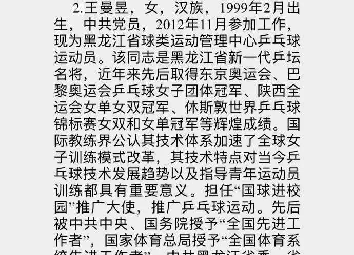 全国体育系统先进个人名单公布,王曼昱凭实力入选,展现龙江健儿风采一