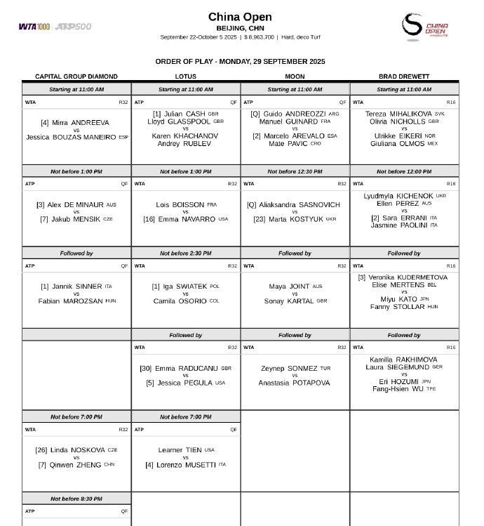 中网赛场,今日赛程!2025年9月29日 不早于19:00,郑钦文vs诺斯科娃,