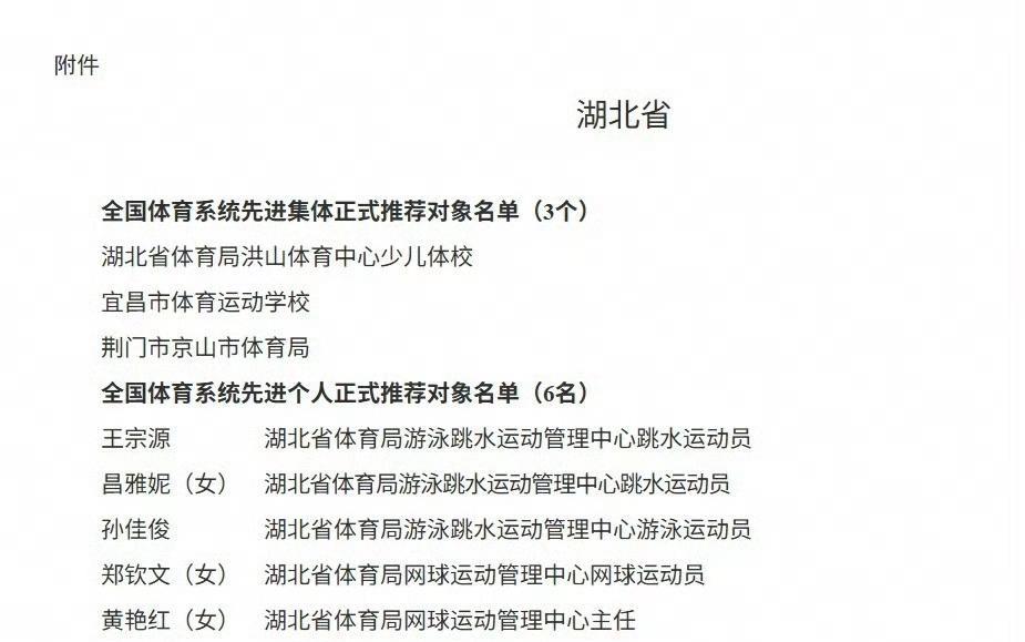 《关于全国体育系统先进集体和先进个人推荐对象的公示》,郑钦文、王宗源、昌雅妮、孙佳俊在列 全国体育系统先进个人正式推荐对象名单(6名)