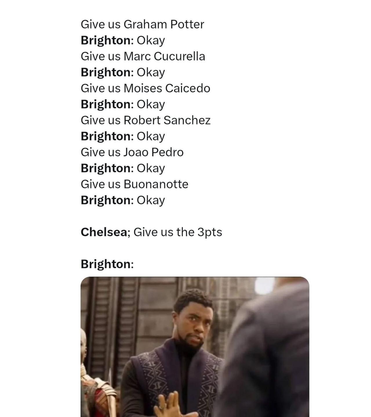 但是…… 第二张图文字内容: 给我们格雷厄姆·波特 布莱顿:好的 给我们马克·库库雷利亚 布莱顿:好的 给我们莫伊塞斯·凯塞多 布莱顿:好的 给我们罗伯特·桑切斯 布莱顿:好的 给我们若昂·佩德罗 布莱顿:好的 给我们布奥纳诺特 布莱顿:好的 切尔西;给我们3分 布莱顿:“我们这里不玩儿这种事”