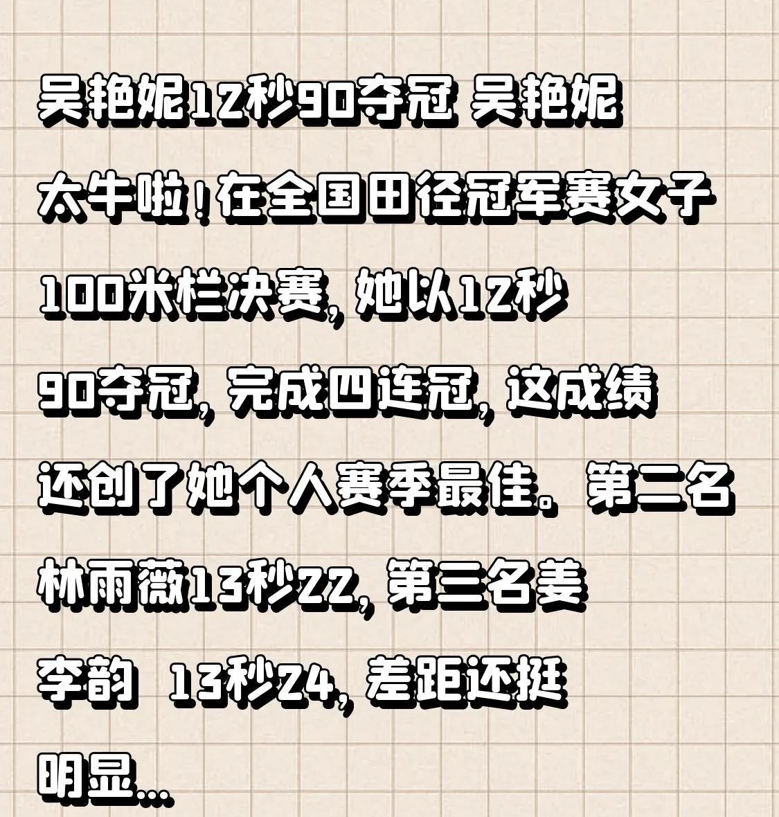 吴艳妮12秒90夺冠 吴艳妮12秒90夺冠,实力惊人!在全国田径冠军赛女子100米栏决赛中,她以12秒90的成绩夺冠,实现四连冠,这也是她个人赛季最佳成绩。第二名林雨薇成绩为13秒22,第三名姜李韵喆是13秒24,差距较为明显。 除2022年疫情赛事停办外,2021、2023、2024年她都夺得冠军赛冠军。今年她参赛颇多,如钻石联赛厦门站、长三角站以及亚洲锦标赛等。在长三角站她跑出12秒96已是不俗表现,此次更是更进一步。尽管世锦赛预赛她以13秒12止步,但她表示运动生涯已翻开新页。期待她后续继续突破,再创佳绩! #吴艳妮# #女子百米夺冠#