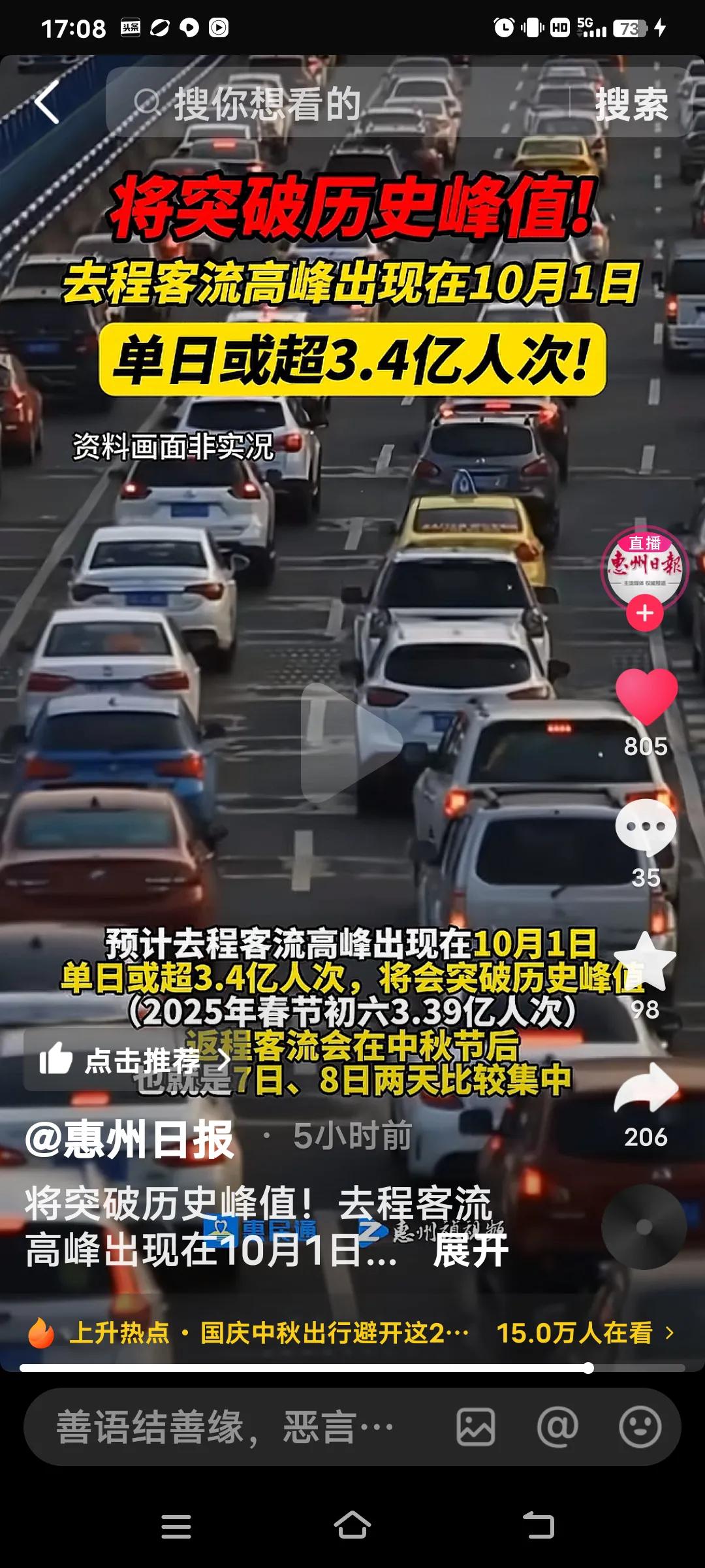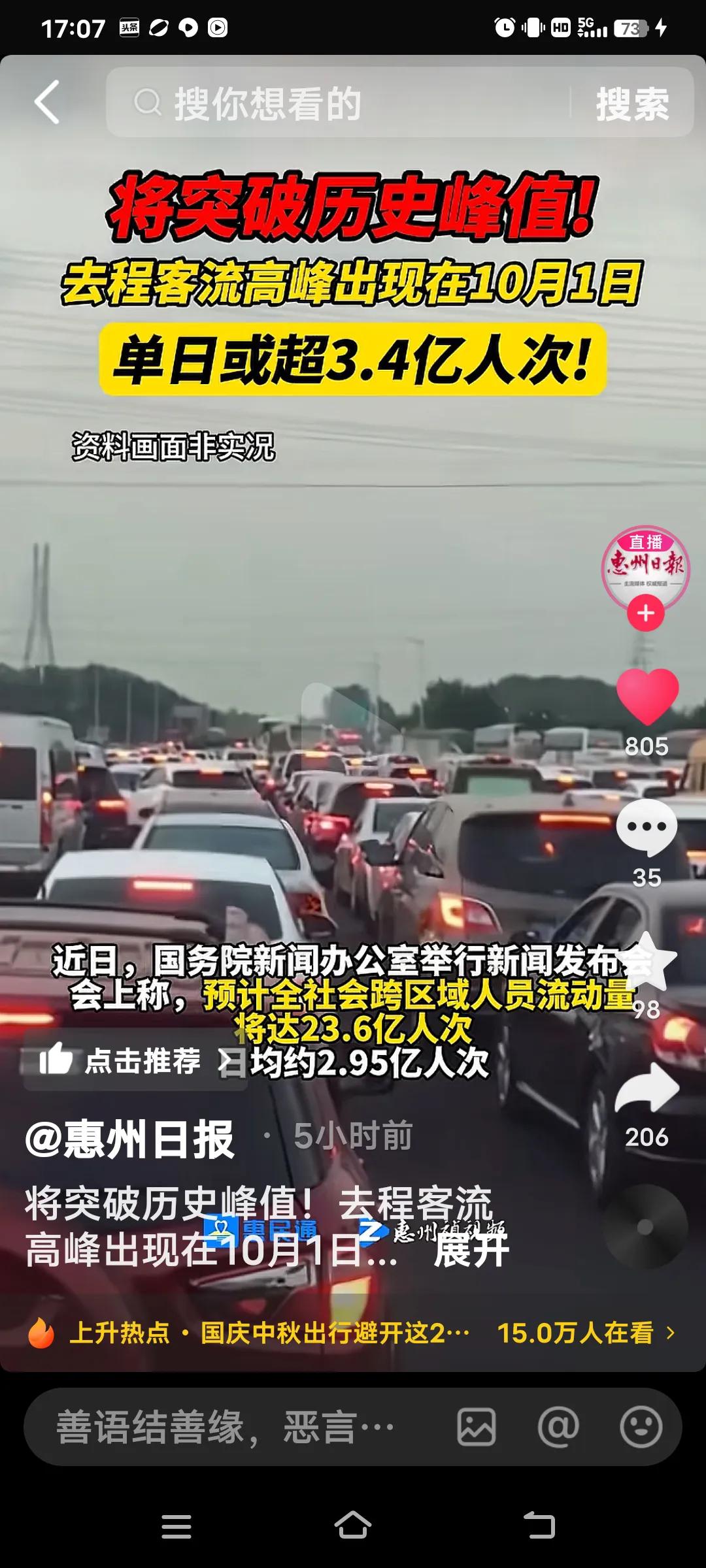 国庆出行高峰要来啦,10月1日当天客流或超3.4亿人次,还要突破历史峰值! 据交通运输部消息,今年中秋国庆8天假,大家主要是旅游、探亲,全社会跨区域人员流动量达23.6亿人次,日均约2.95亿人次,比去年同期增长约3.2%。去程高峰在10月1日,返程高峰在7日、8日。 想想那场景,到处人挤人,交通估计堵得水泄不通。要是这时候出去,真得做好心理准备。没安排的朋友,要不考虑在家“云旅游”,避开这人潮? 国庆出行潮 十一出行人次 国庆堵人景点 国庆客流 出游人流量