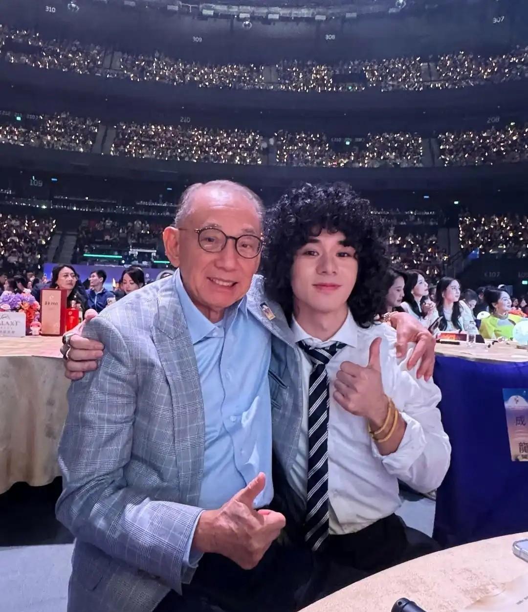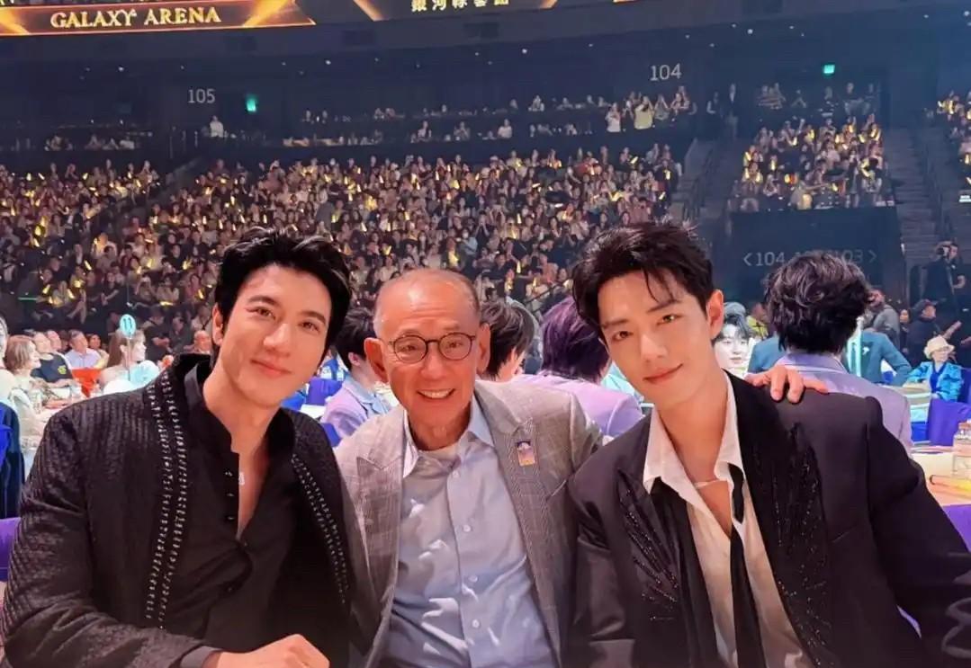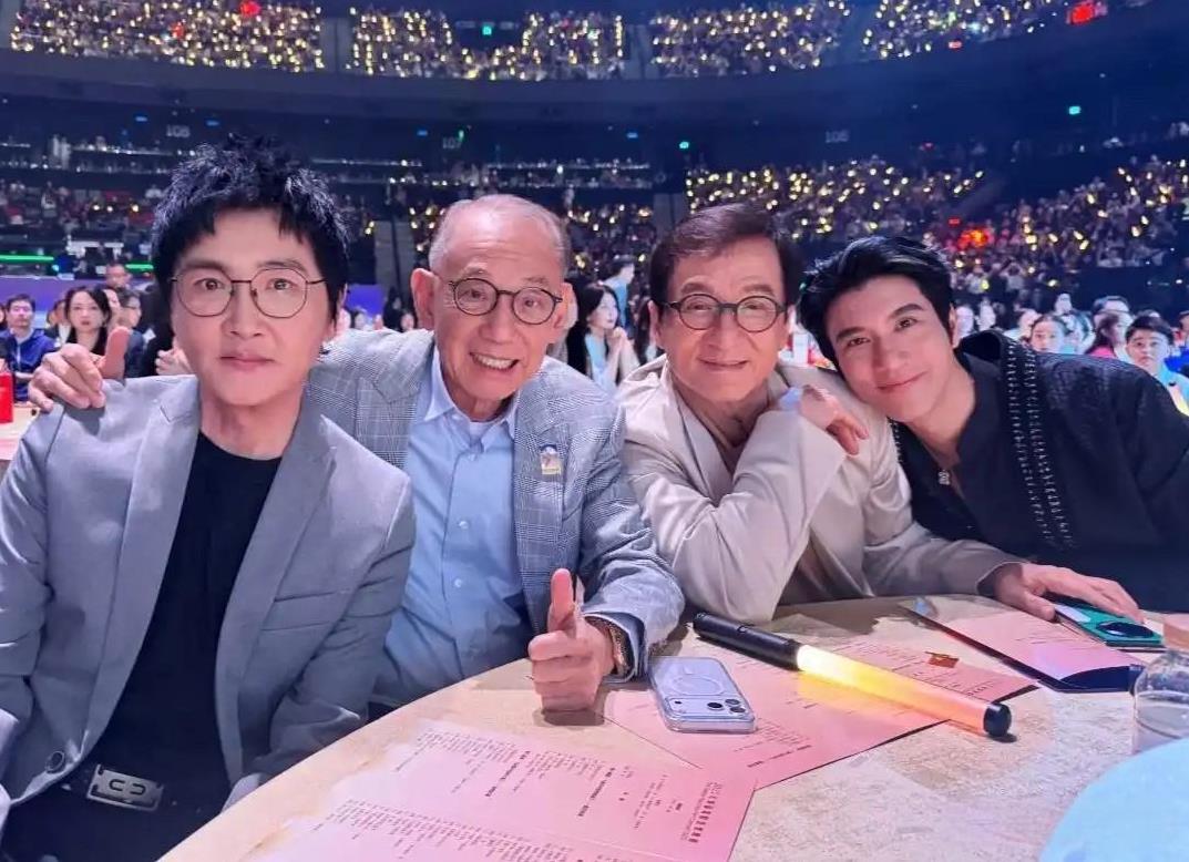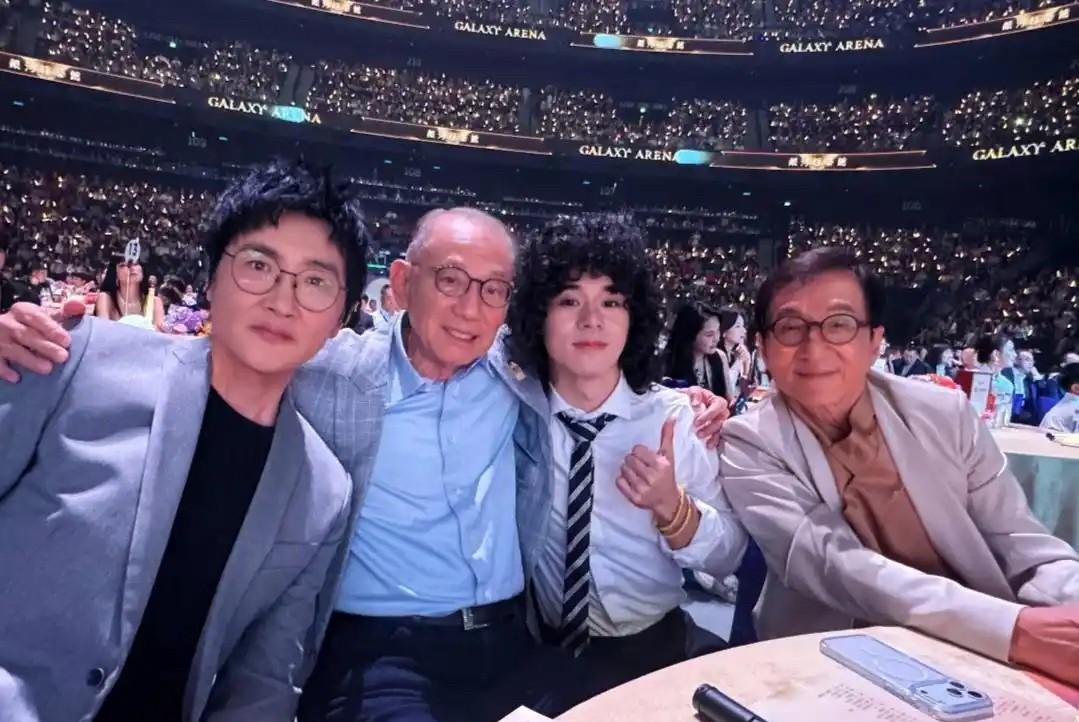 湾区升明月晚会,英皇老板杨受成与成龙肖战等人合影,阵容太强了。杨受成亲切地搂着孙楠的肩膀并竖起大拇指;成龙紧挨其旁,地位不凡;王力宏坐姿端正,帅气不减;容祖儿微微倾向肖战,状态甚佳;而一身西装的肖战更是英挺出众。另一张三人合照中,杨受成稳居C位,右侧是风采依旧的王力宏,左侧则是俊朗的肖战。49岁的王力宏颜值依然在线,与33岁的肖战同框,完全感觉不到16岁的年龄差,让人不禁感叹其保养功力![得意][得意]