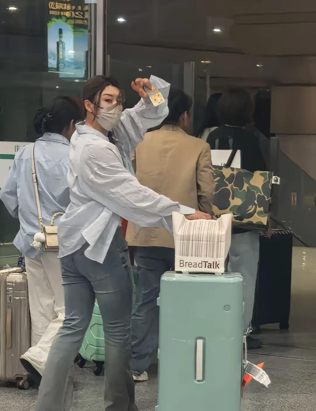 图上看陈梦最近发胖挺严重,这牛仔裤下粗壮的大腿让人叹为观止! 梦姐行李箱上放着品