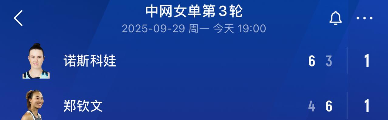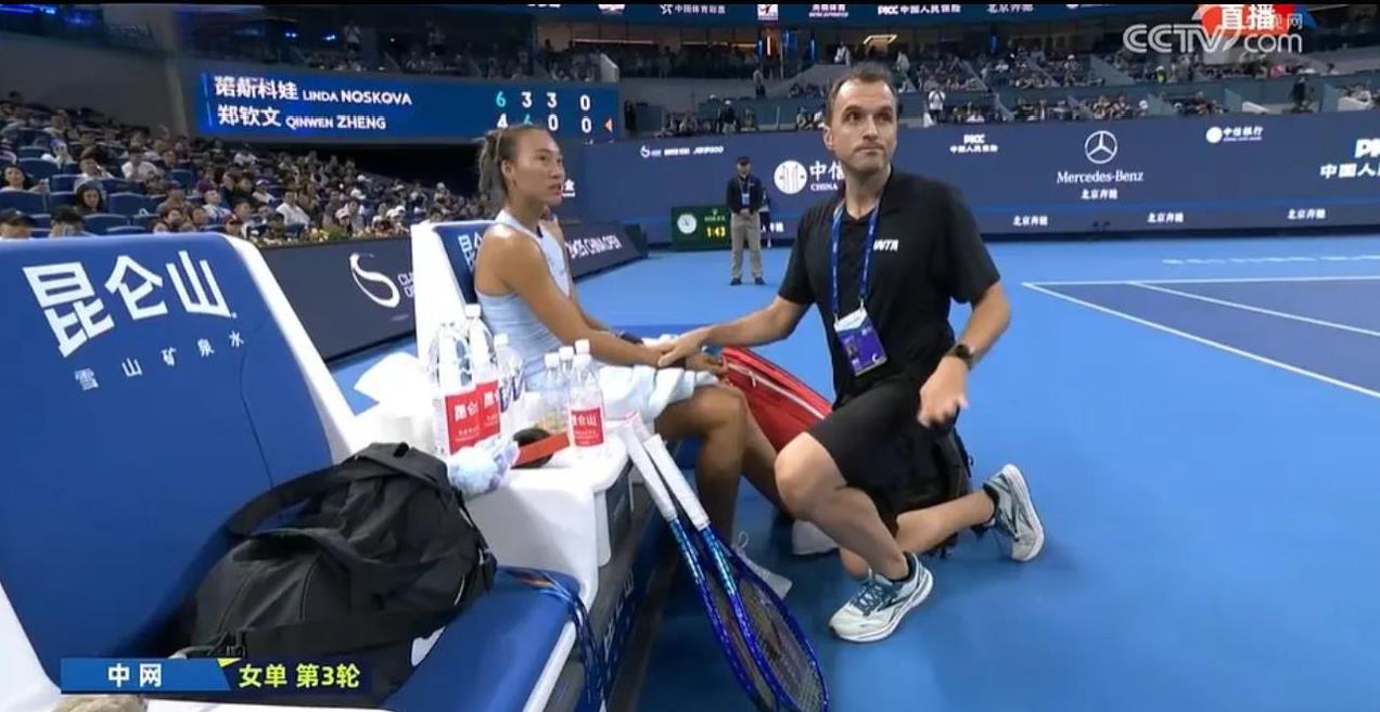 今晚,中国网球公开赛第三轮,也是郑钦文因伤复出后的第二场比赛,对阵此前刚刚淘汰了王曦雨、WTA单打排名第27位的捷克选手诺斯科娃,此前两人曾有过两次交手,郑钦文以2:0完胜。 受肘部术后尚未完全恢复的影响,郑钦文第一盘在发球环节明显不敢发力,尽管发出了多达4记ACE球,但同时也有4个双误,一发成功率仅为53%;其次,诺斯科娃身高力大,底线相持球势大力沉、丝毫不落下风,迫使郑钦文非受迫性失误多达16个;此外,郑钦文抓机会球、兑现破发点的能力一直是自身的弱点,这在去年年底总决赛与高芙的对垒等比赛中均有明显体现。第一盘郑钦文以4:6告负。 第二盘,郑钦文的一发成功率大幅提升,达到了73%,发出3记ACE、仅有1次双误;同时在气势上也始终处于压制诺斯科娃的状态,最终郑钦文以3:6扳回一盘,双方战成1-1。 决胜盘,郑钦文后发被对手率先破发,一上来便以0:3落后,陷入了十分被动的局面。后经现场医疗陪护员的检查确认,郑钦文肘伤已无法支撑余下比赛,便主动与诺斯科娃握手致意申请了退赛。