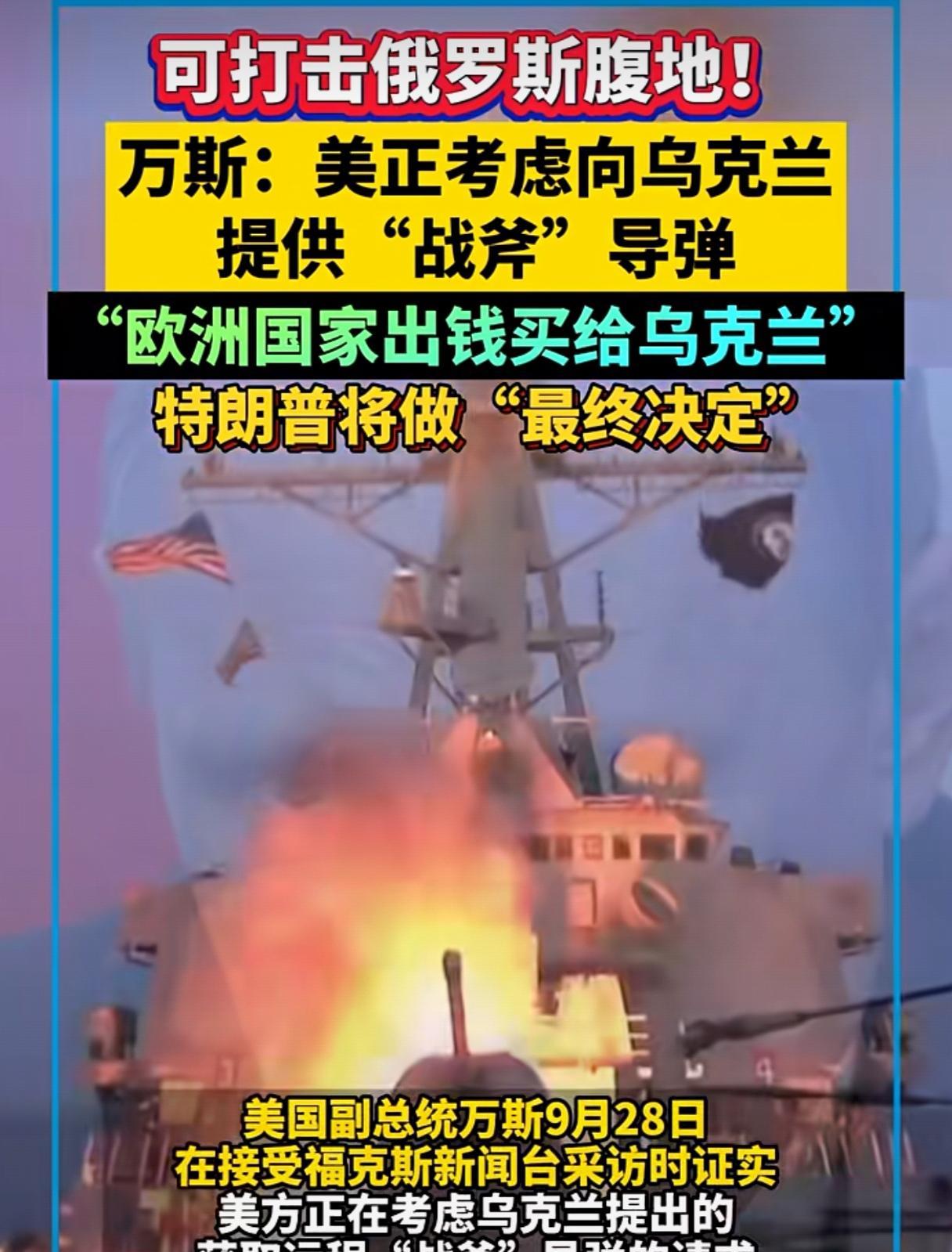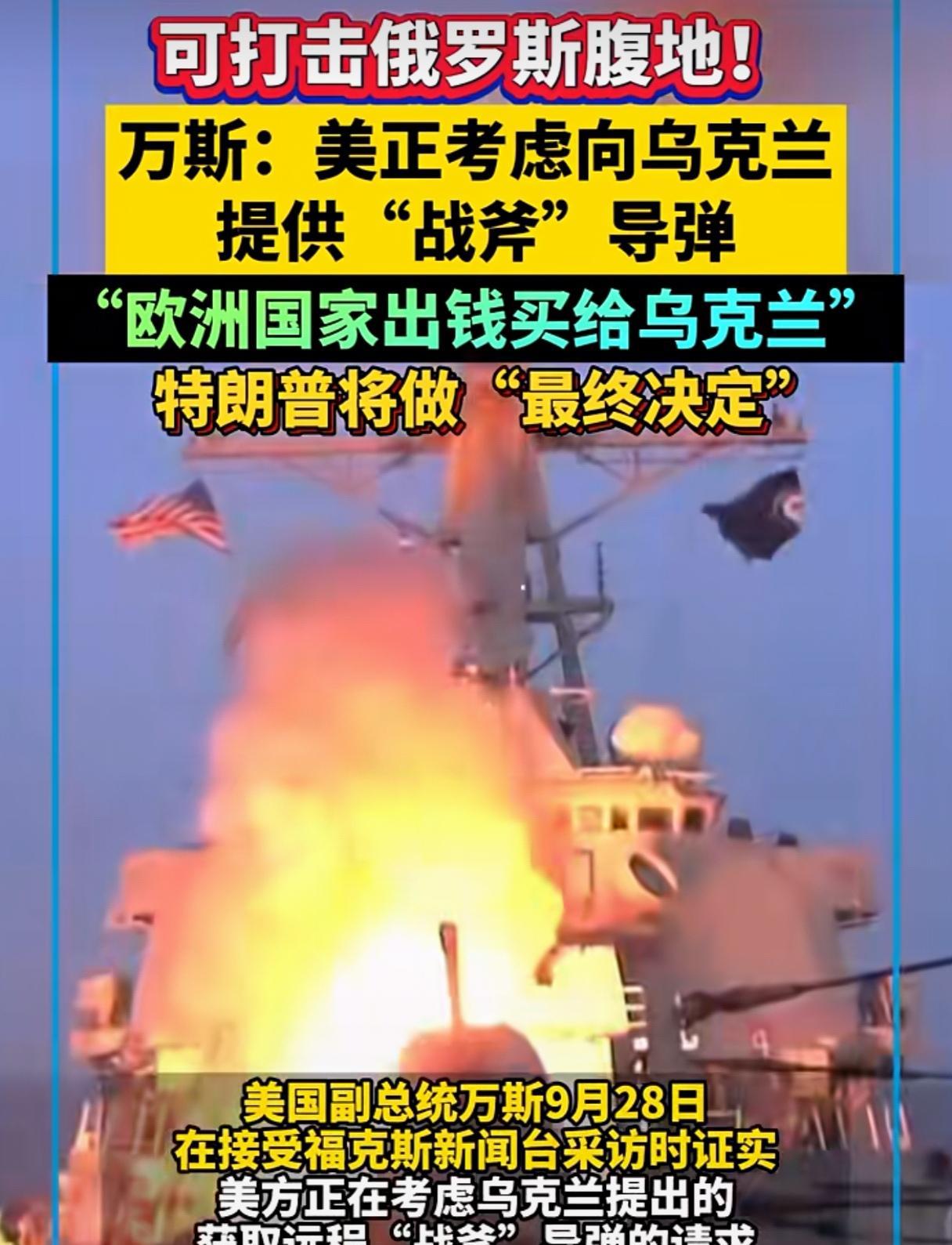 俄罗斯普京可能要迎来美西方最大规模的挑战,俄乌战争或将面临最终对决!美国副总统万斯称:美国正在考虑向乌克兰提供“战斧”导弹。特朗普将做“最终决定”! 美国副总统万斯9月28日,在接受福克斯新闻台采访时证实美国在考虑乌克兰提出的获取远程“战斧”导弹的请求,万斯称:美国总统特朗普将就是否批准这笔军售做“最终决定”。 综合多家媒体报道:“战斧”导弹射程从1500公里到2400公里,这些导弹可以打击俄罗斯腹地。更有意思的是美国提供的“战斧”导弹将由欧盟国家出钱购买。 另据俄罗斯媒体报道,9月28日,俄总统秘书佩斯科夫在接受记者提问:如果乌克兰袭击克里姆林宫,俄罗斯如何应对,佩斯科夫称:“最好不要再问了,每个人都明白后果”。