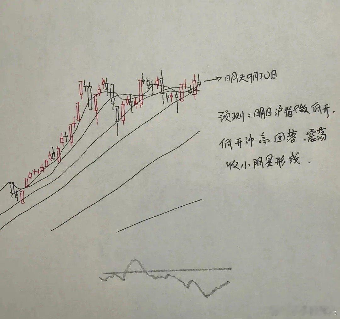 综合以上分析,莎莎认为明天市场指数或者收出一颗震荡盘整的小阴星的走势。那么明天A股到底怎么走?大家请看图三关于明天走势的手绘预测图